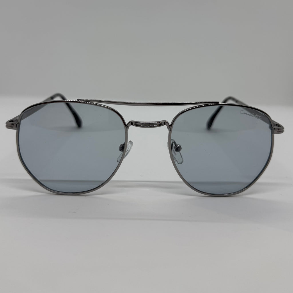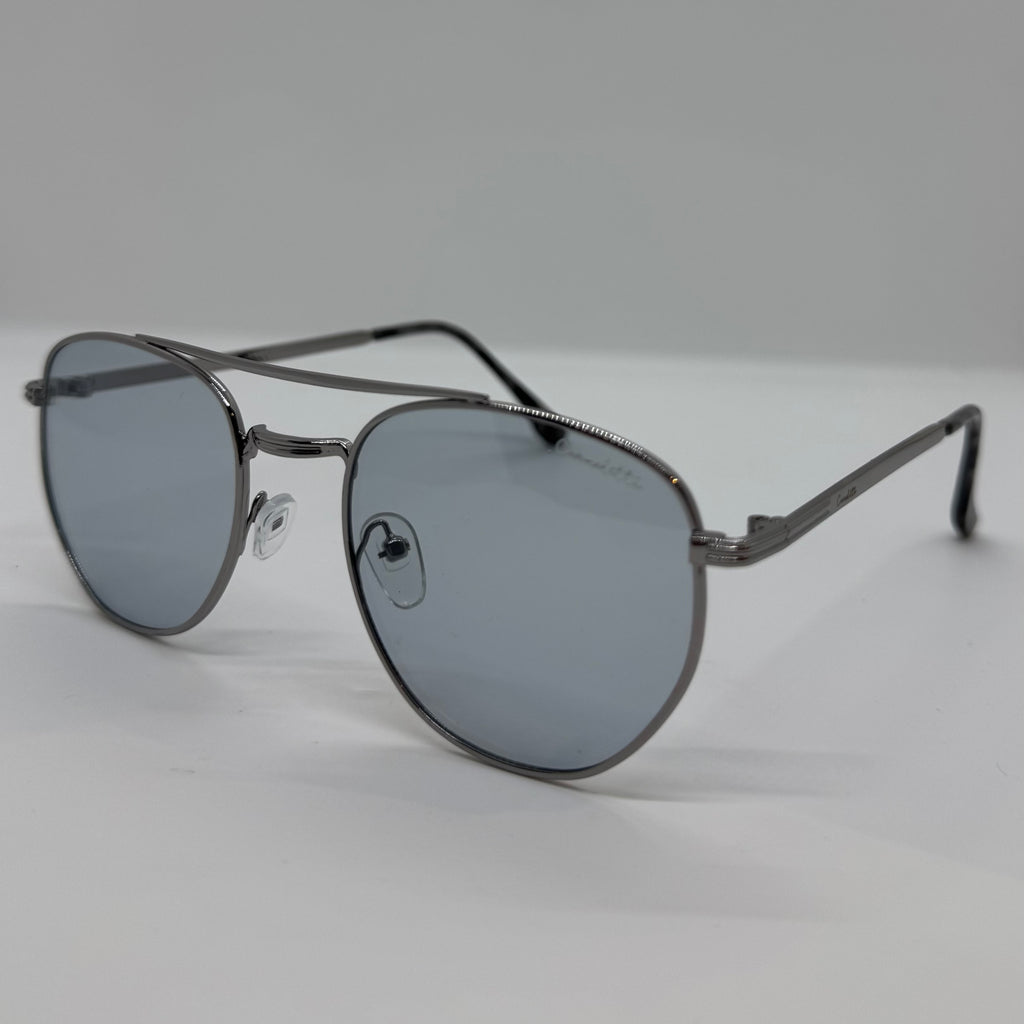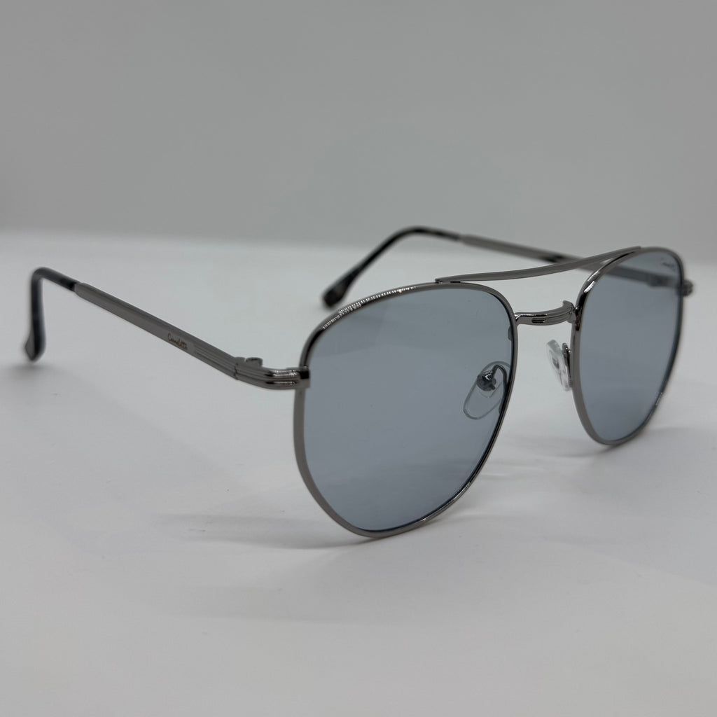Óculos com hastes em metal prata com lente azul. (Lente clara)
