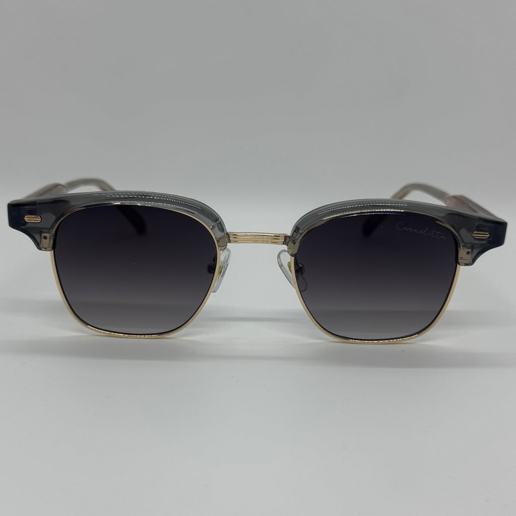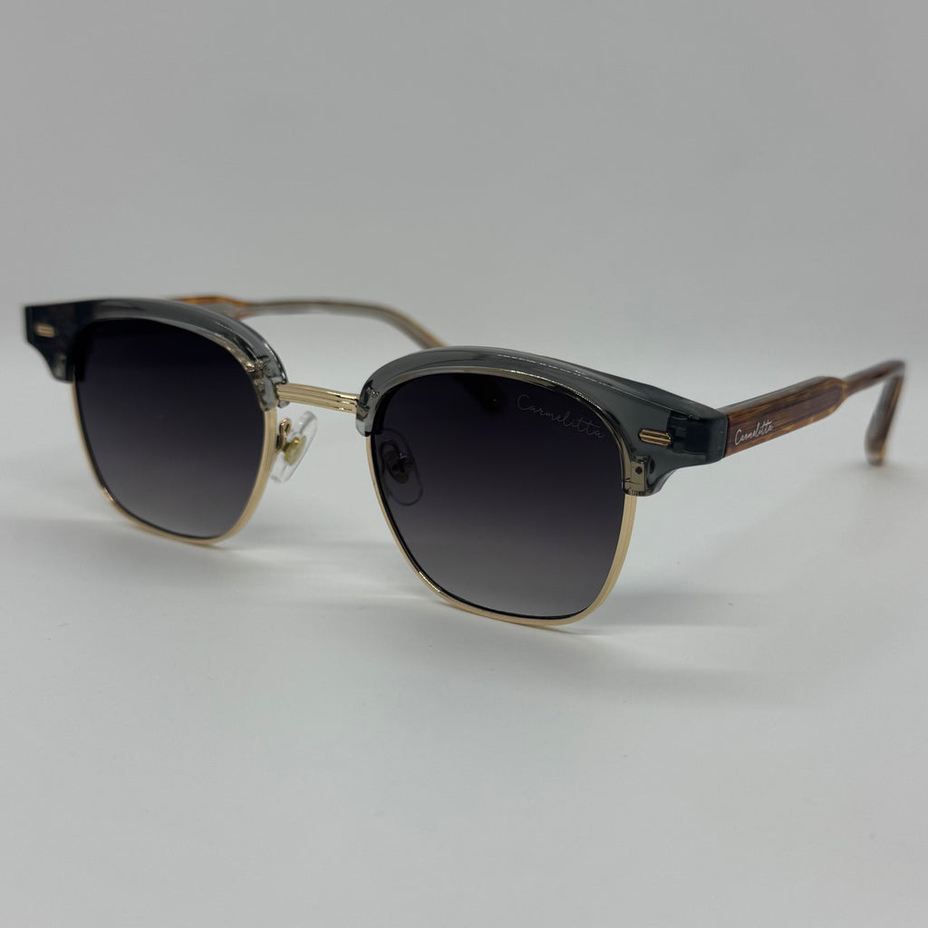 Óculos com hastes em acetato tartaruga, frete cinza translúcido com lente roxa degrade.