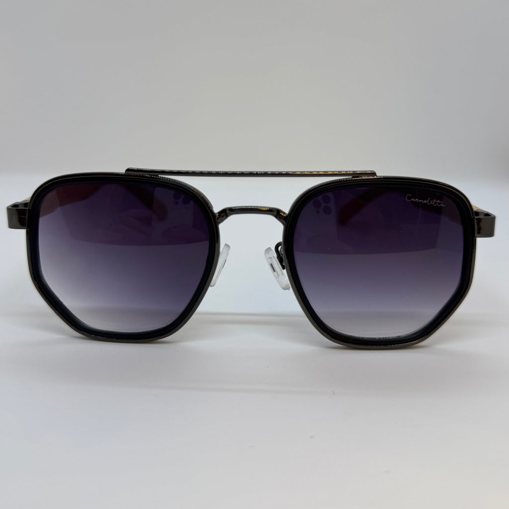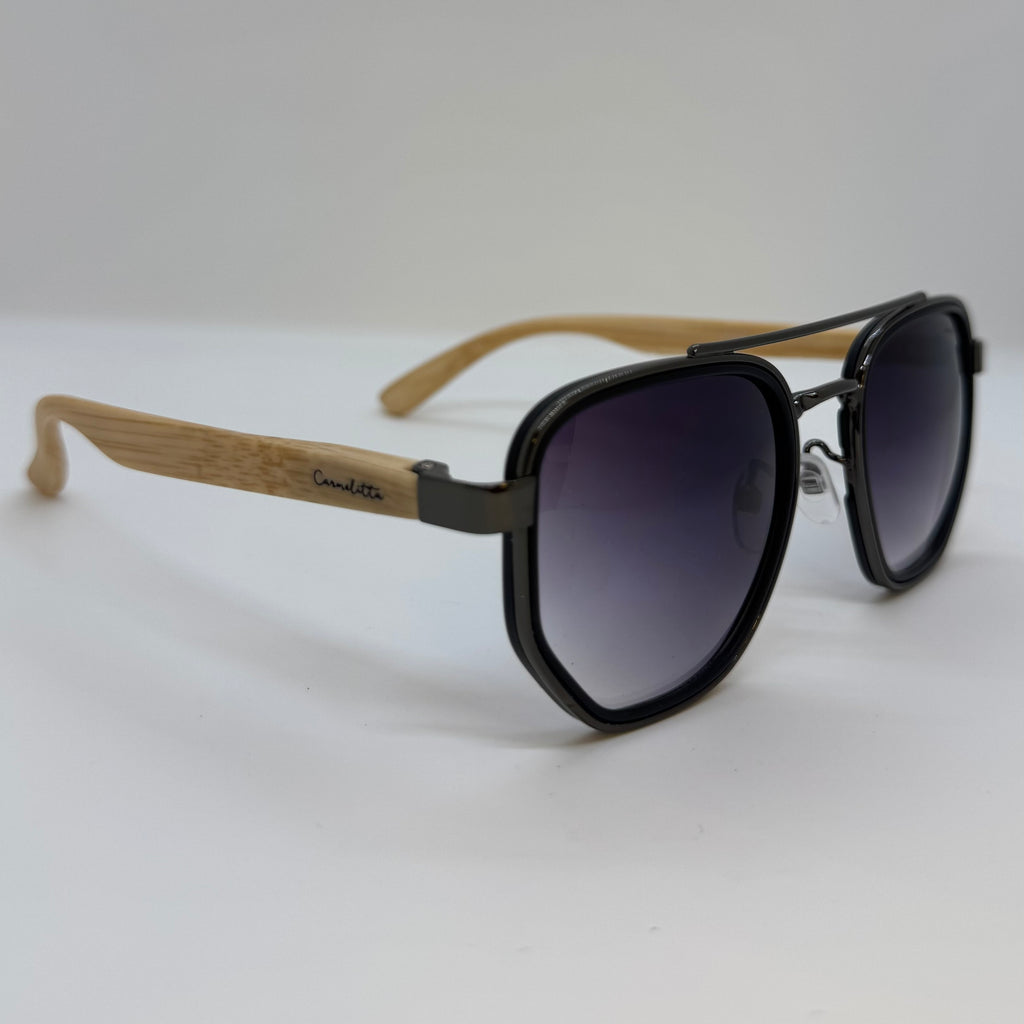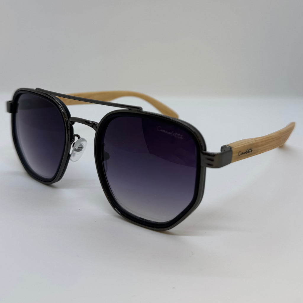Óculos com hastes em bambu claro, frente em metal preto com lente roxa degrade.