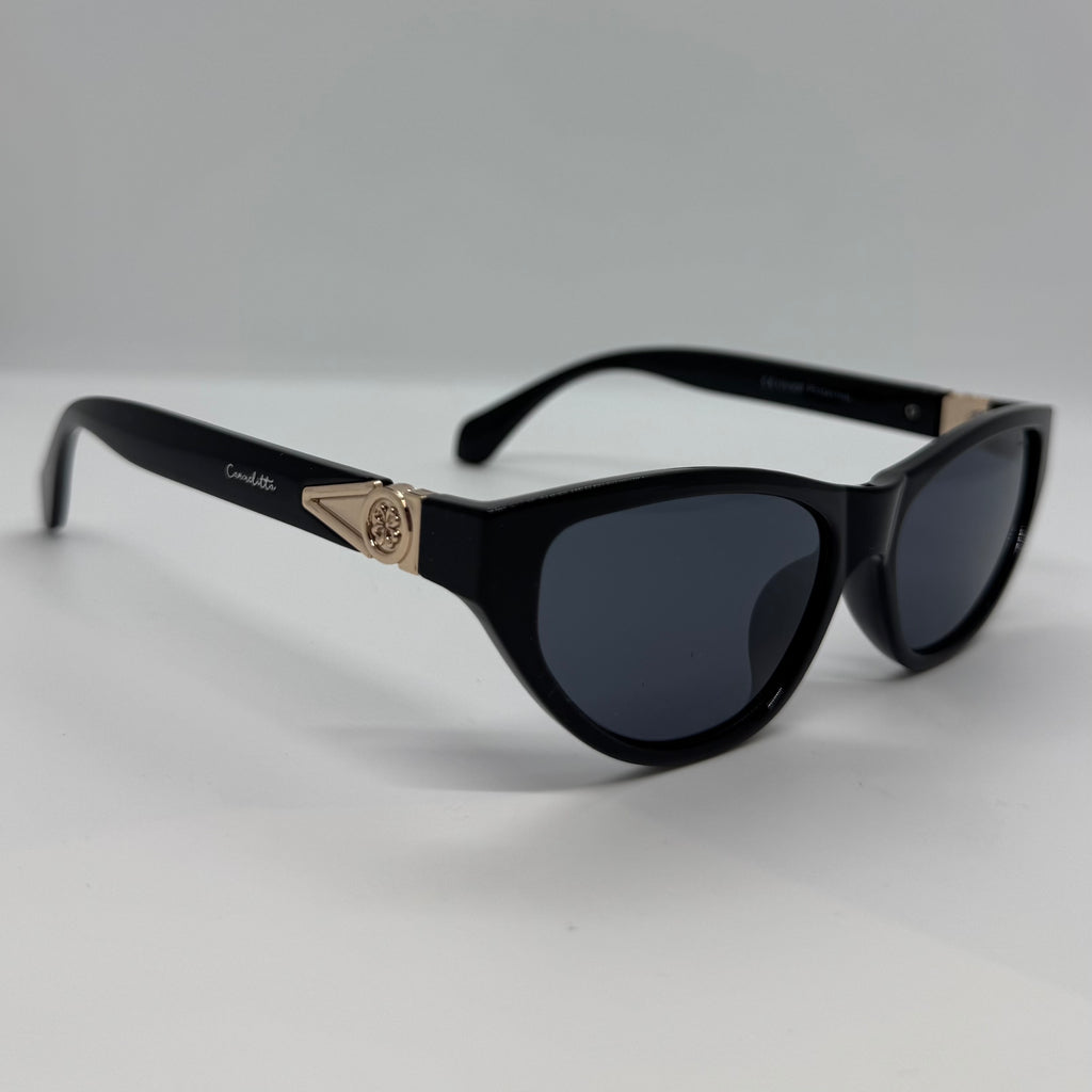 Óculos com hastes em acetato preto com detalhe dourado e lente preta.