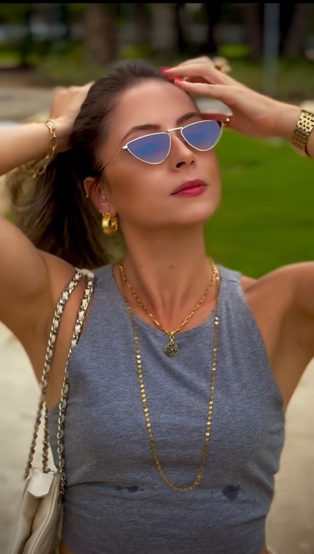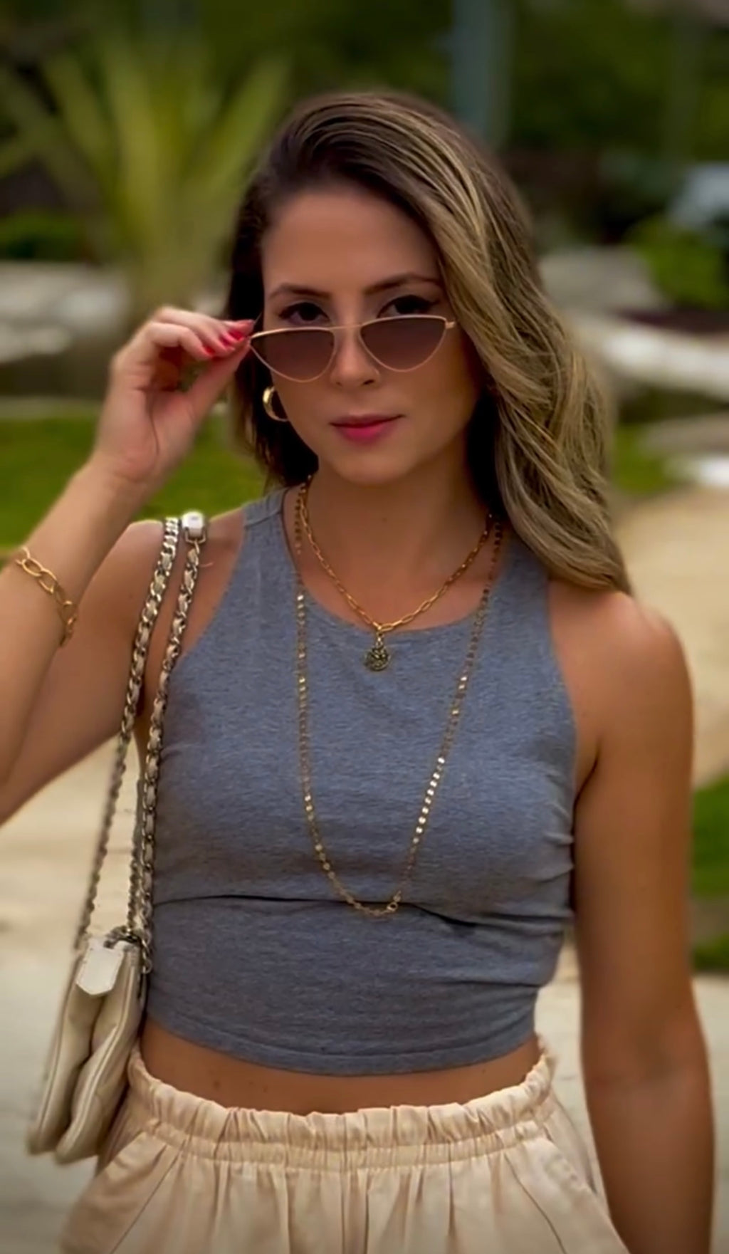 Óculos com hastes em metal e lente marrom degrade.