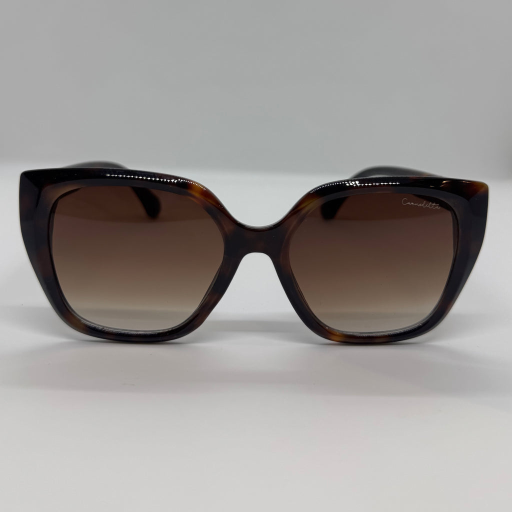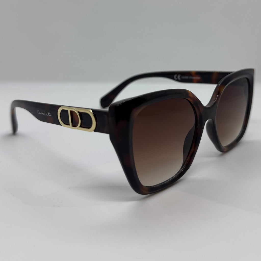 Óculos com hastes em acetato marrom com detalhes dourado e lente marrom degrade.