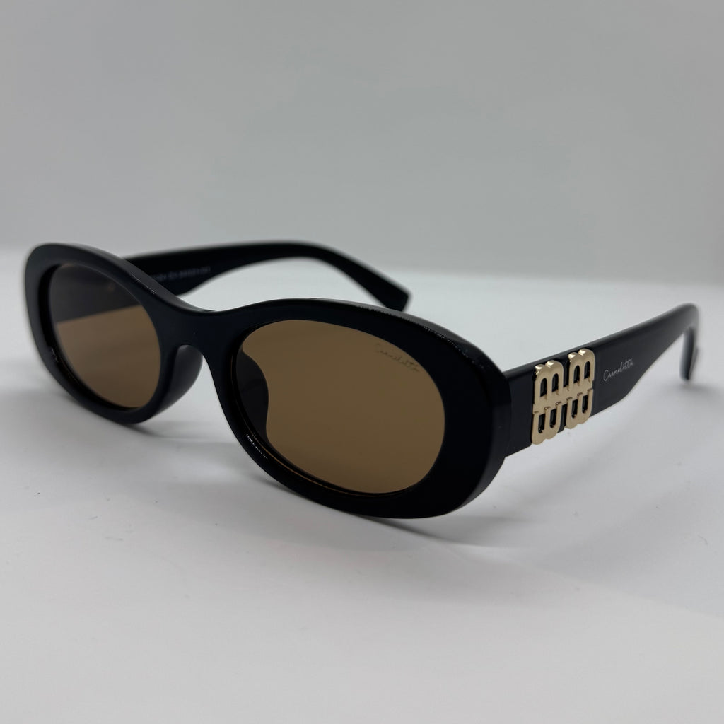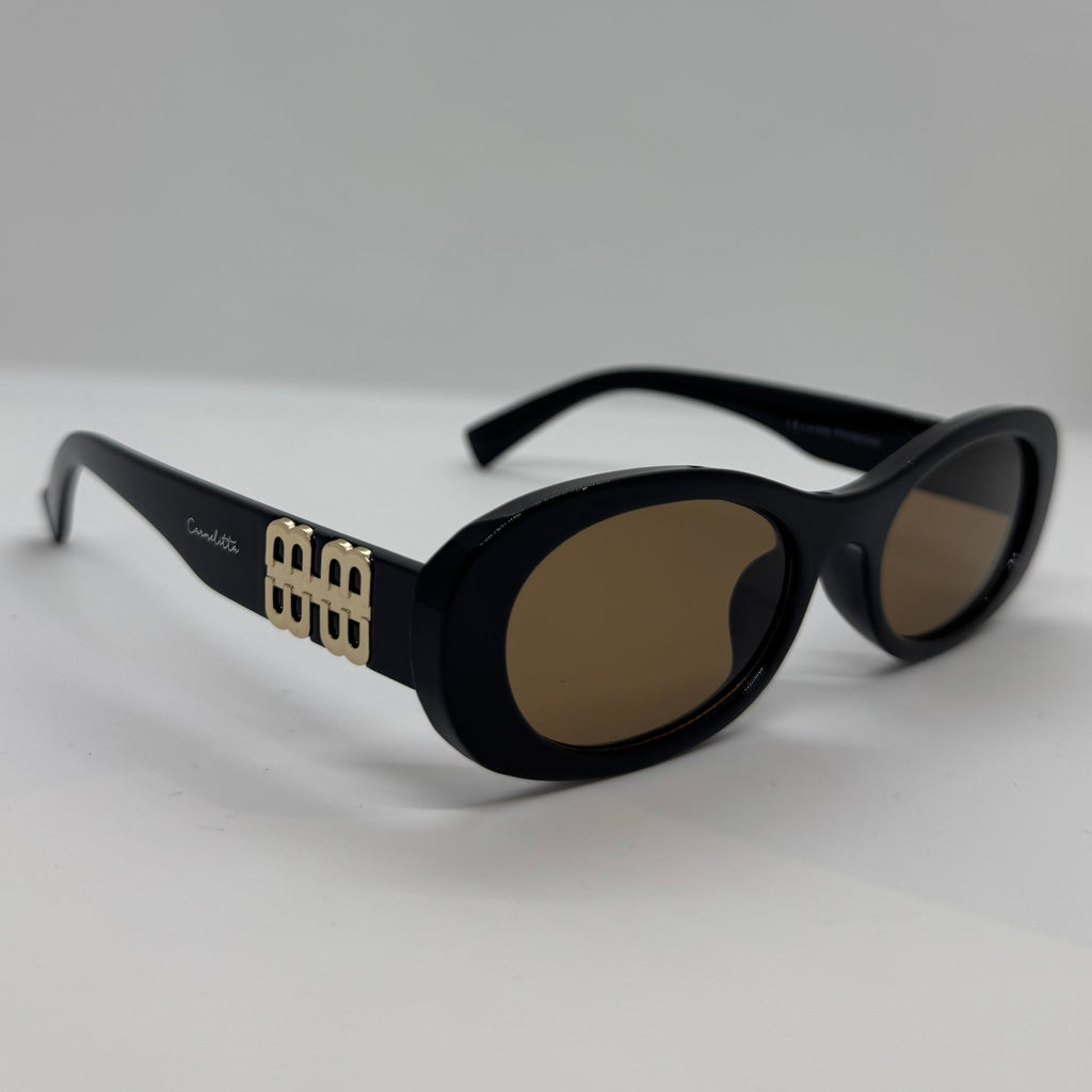 Óculos com hastes em acetato marrom com detalhes dourado e lente marrom.