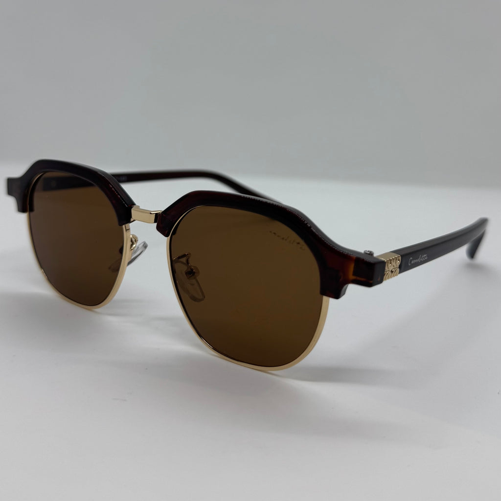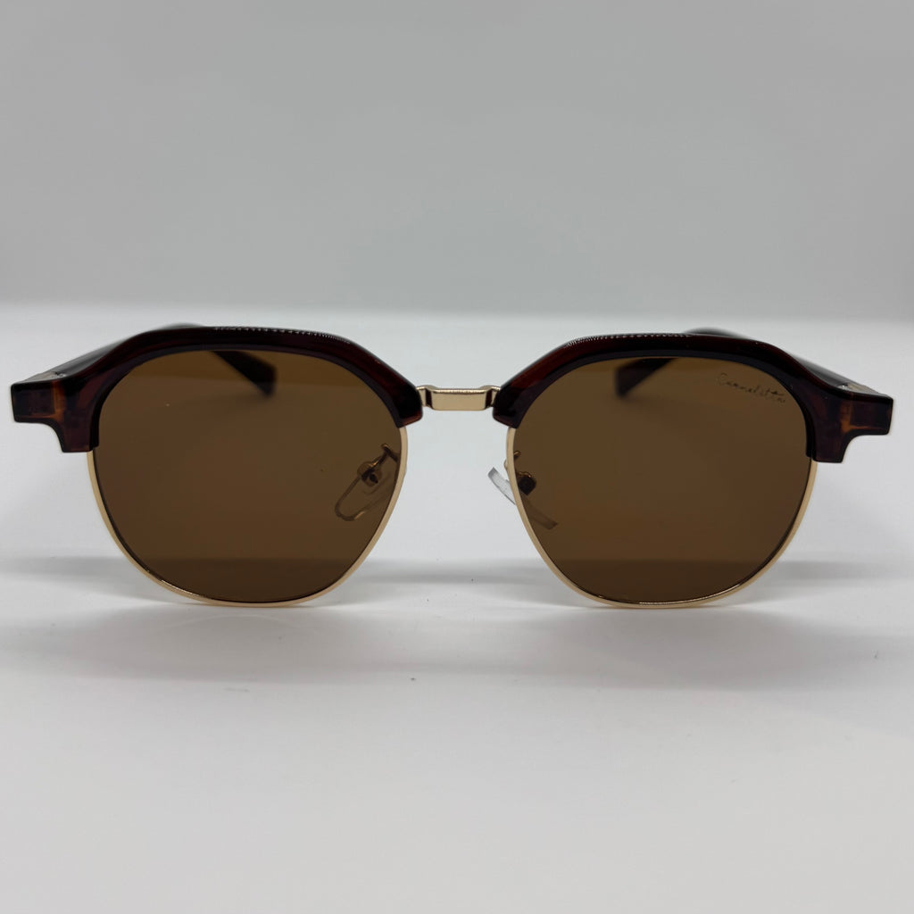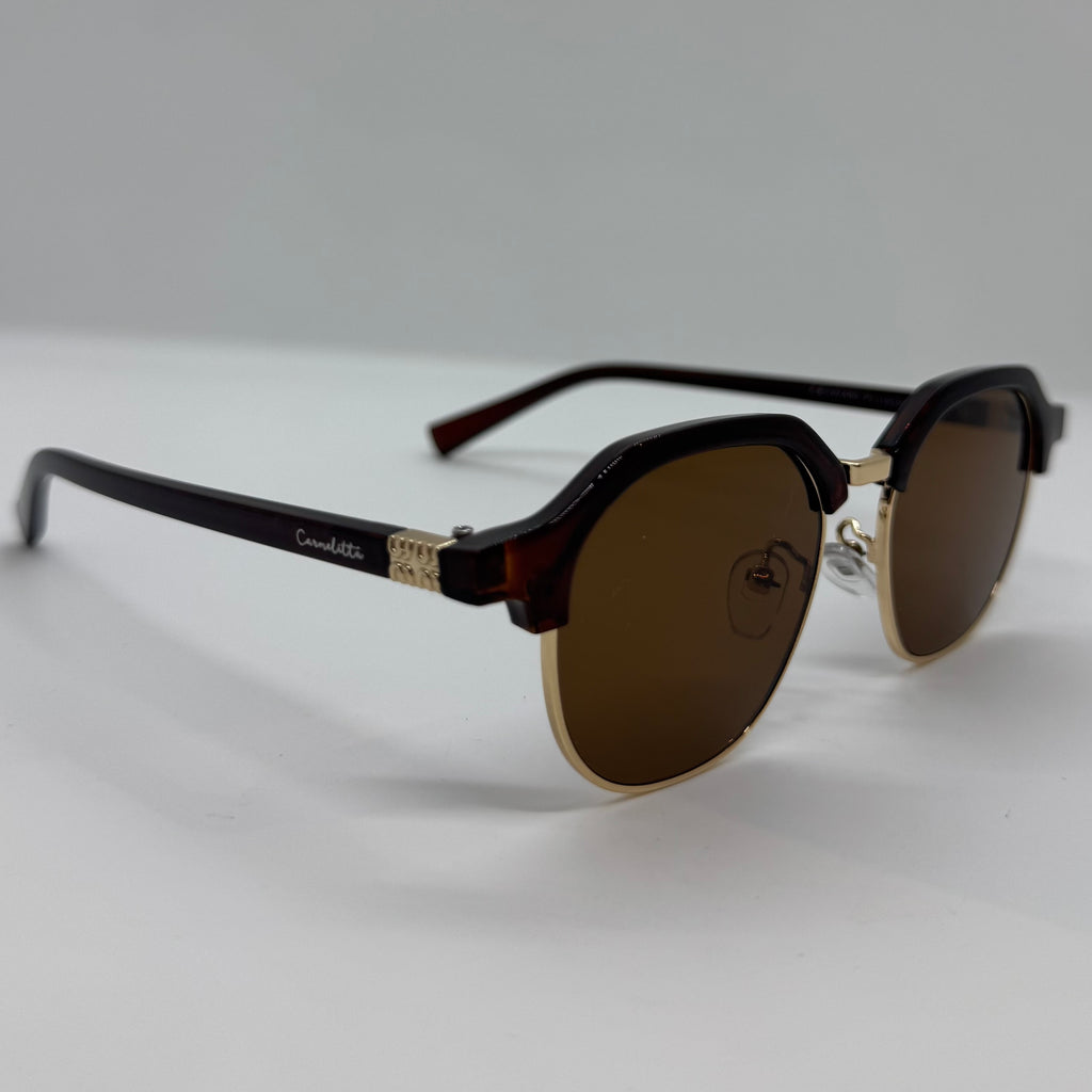 Óculos com hastes em acetato marrom, frente com detalhes dourado e lente marrom.