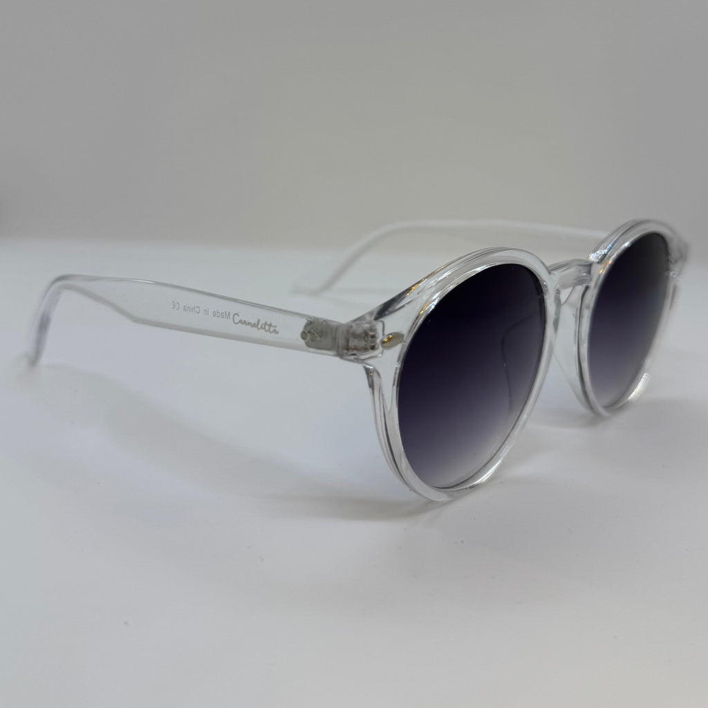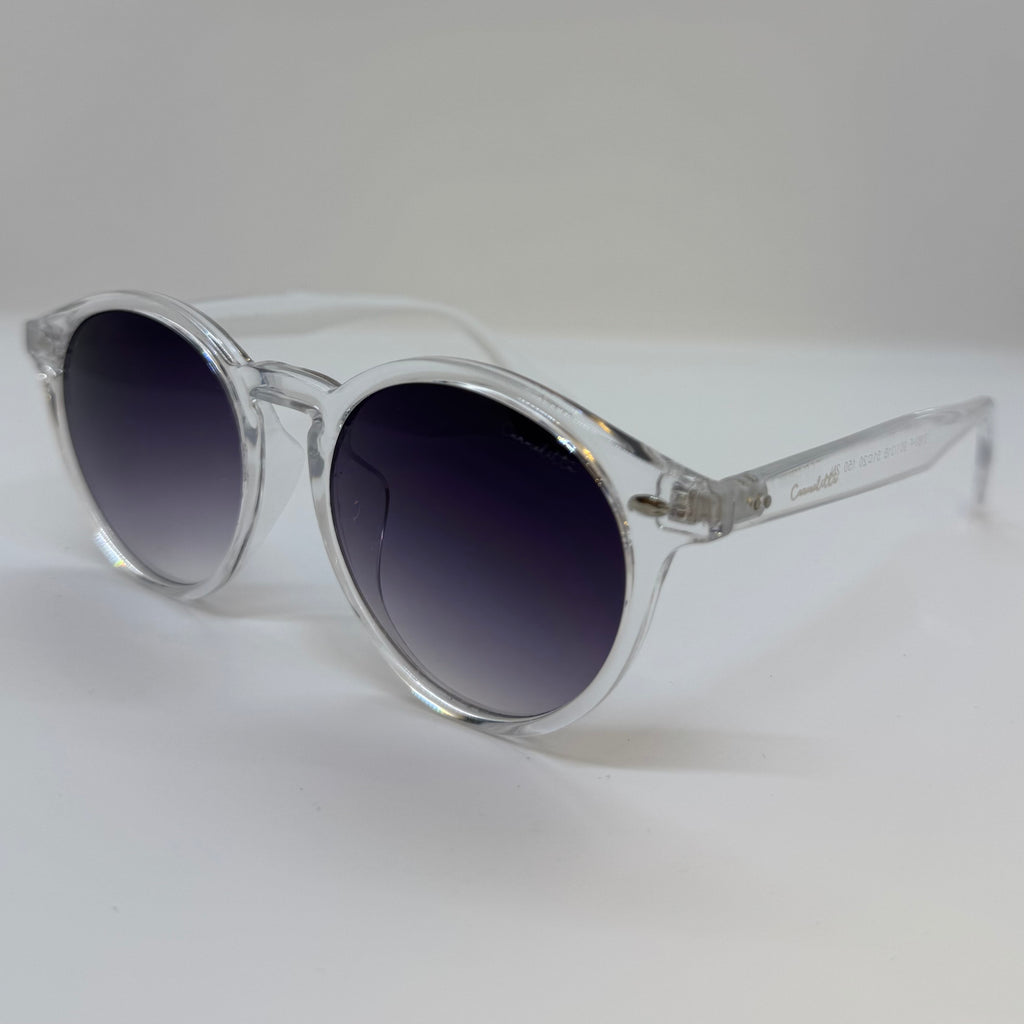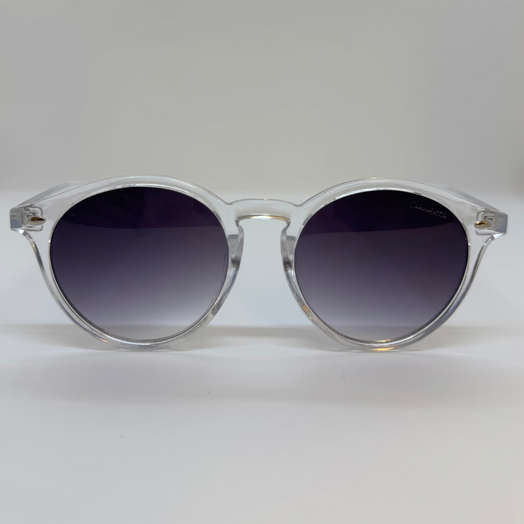 Óculos com hastes em acetato transparente com lente roxa degrade.