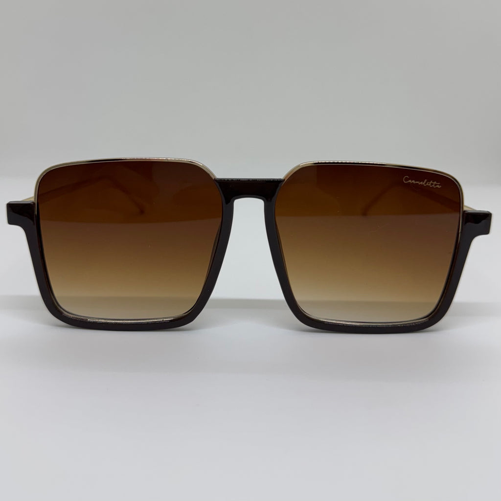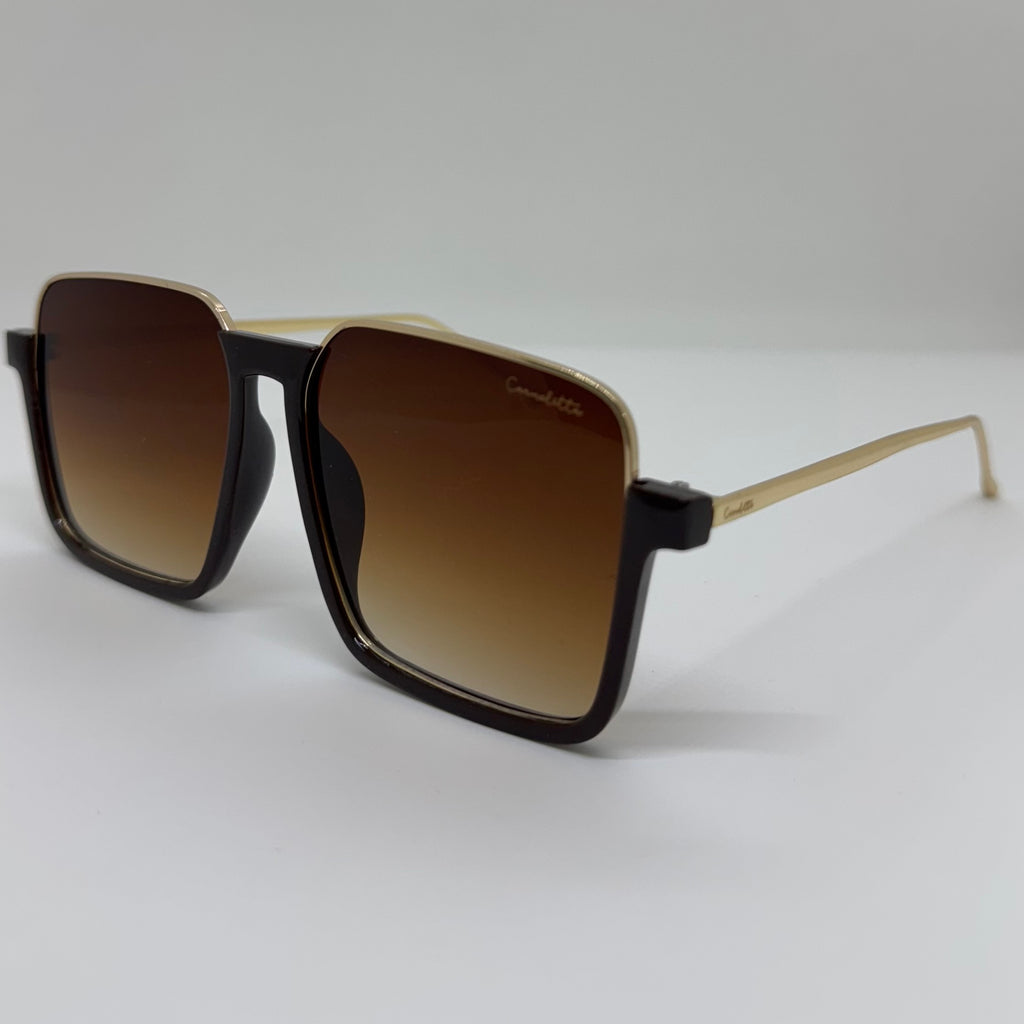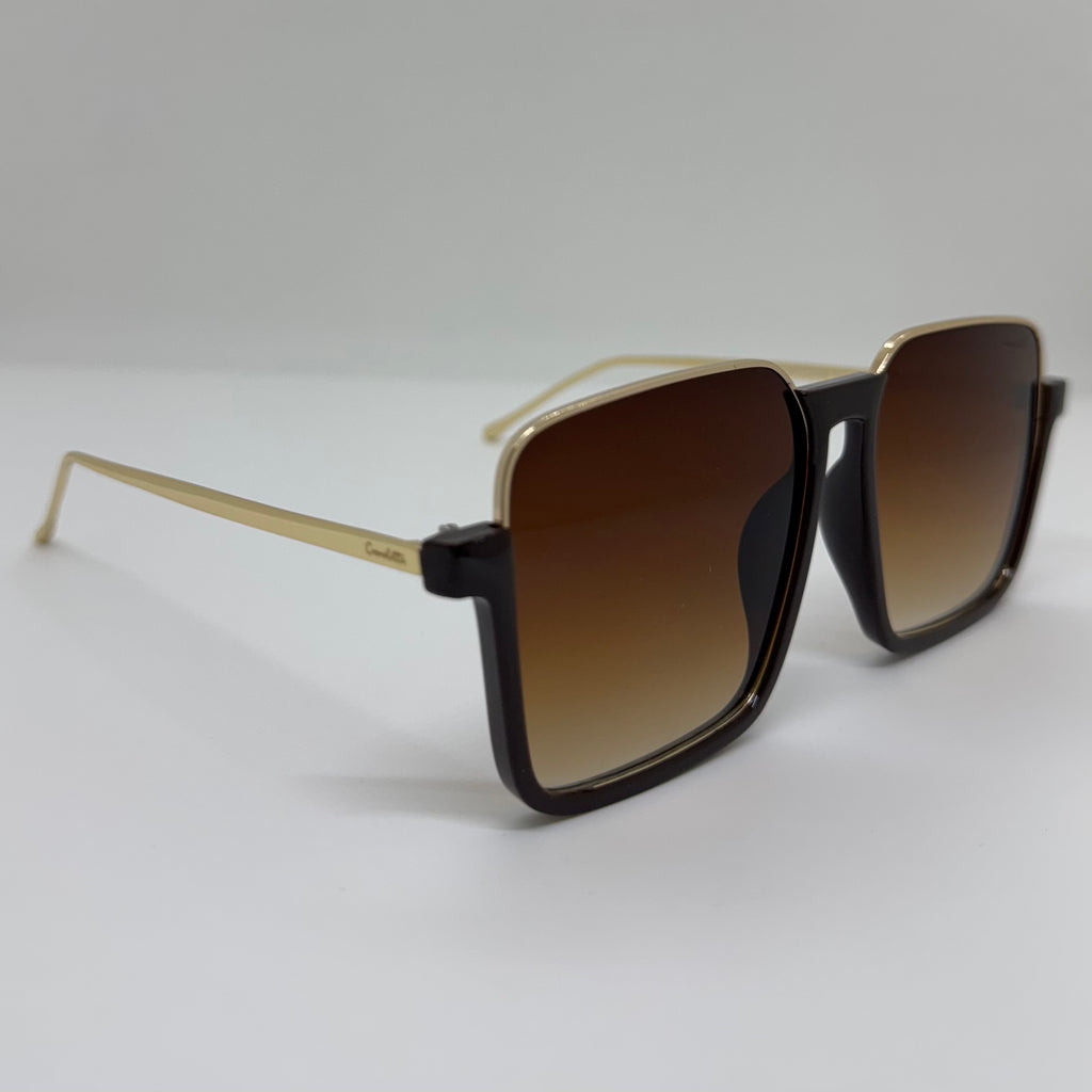 Esse modelo tem armação marrom com detalhes em dourado metálico nas hastes e na parte superior da frente, dando um toque elegante e sofisticado.