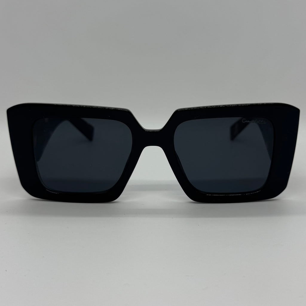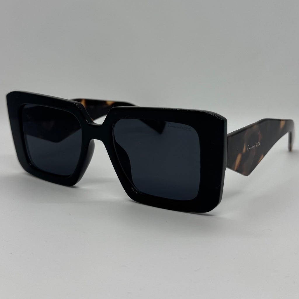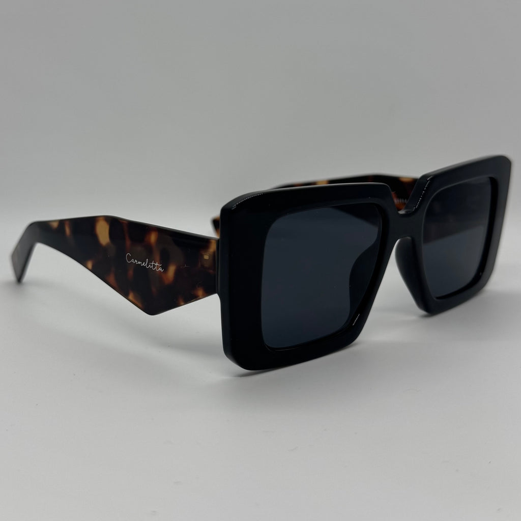 Óculos com hastes em acetato tartaruga com frente preta e lente preta.