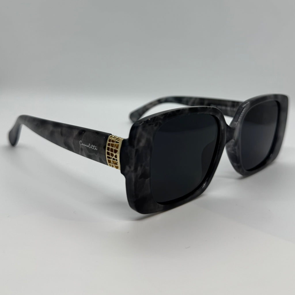 Óculos com hastes em acetato com aparência marmorizado e lente preta.