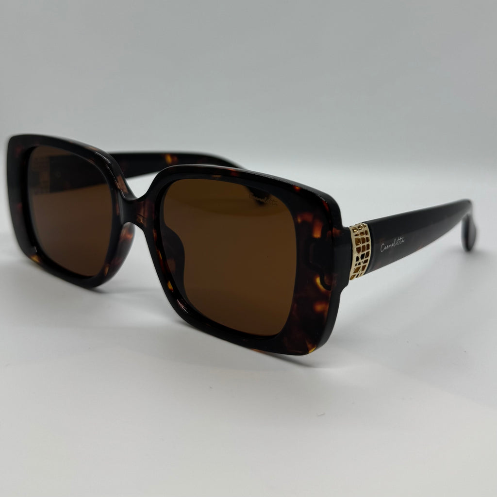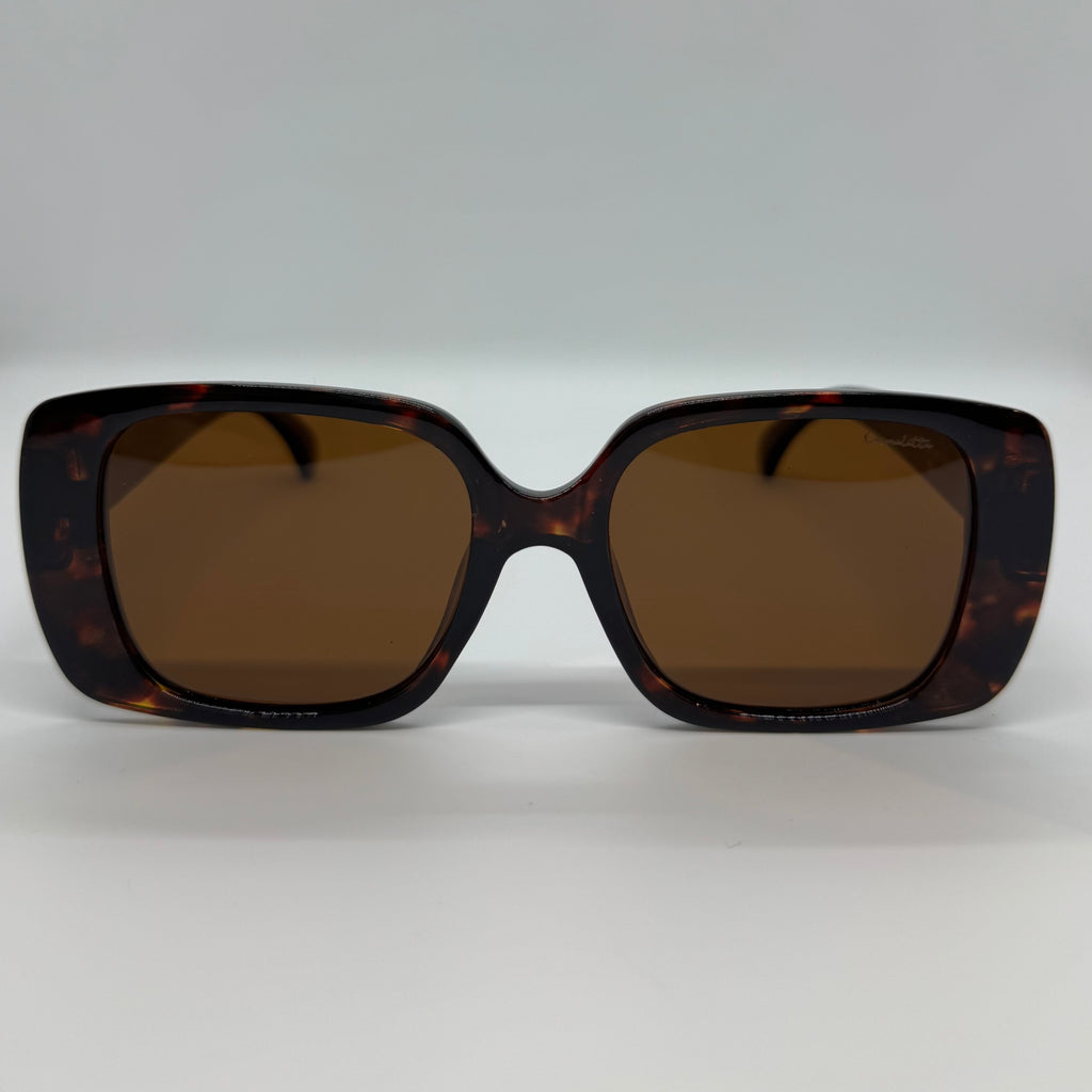 Óculos com hastes em acetato tartaruga com lente marrom.