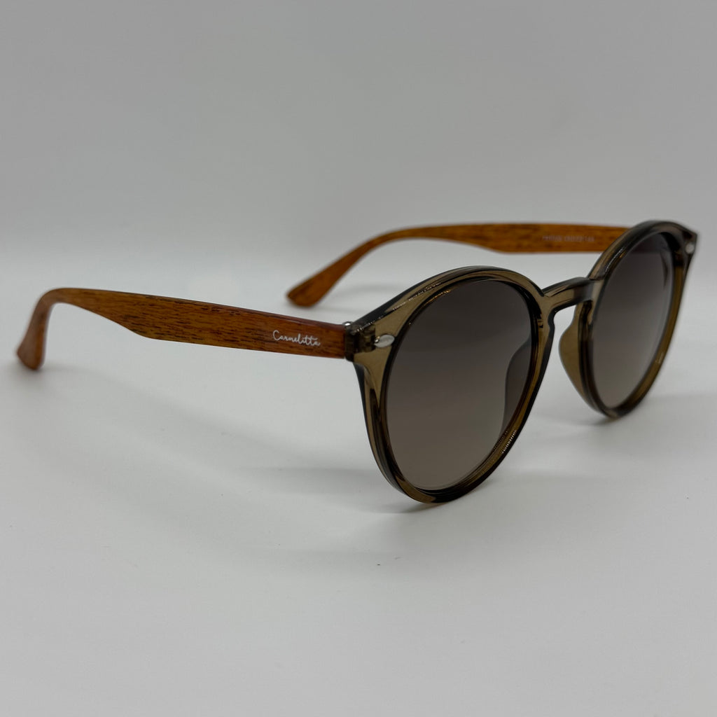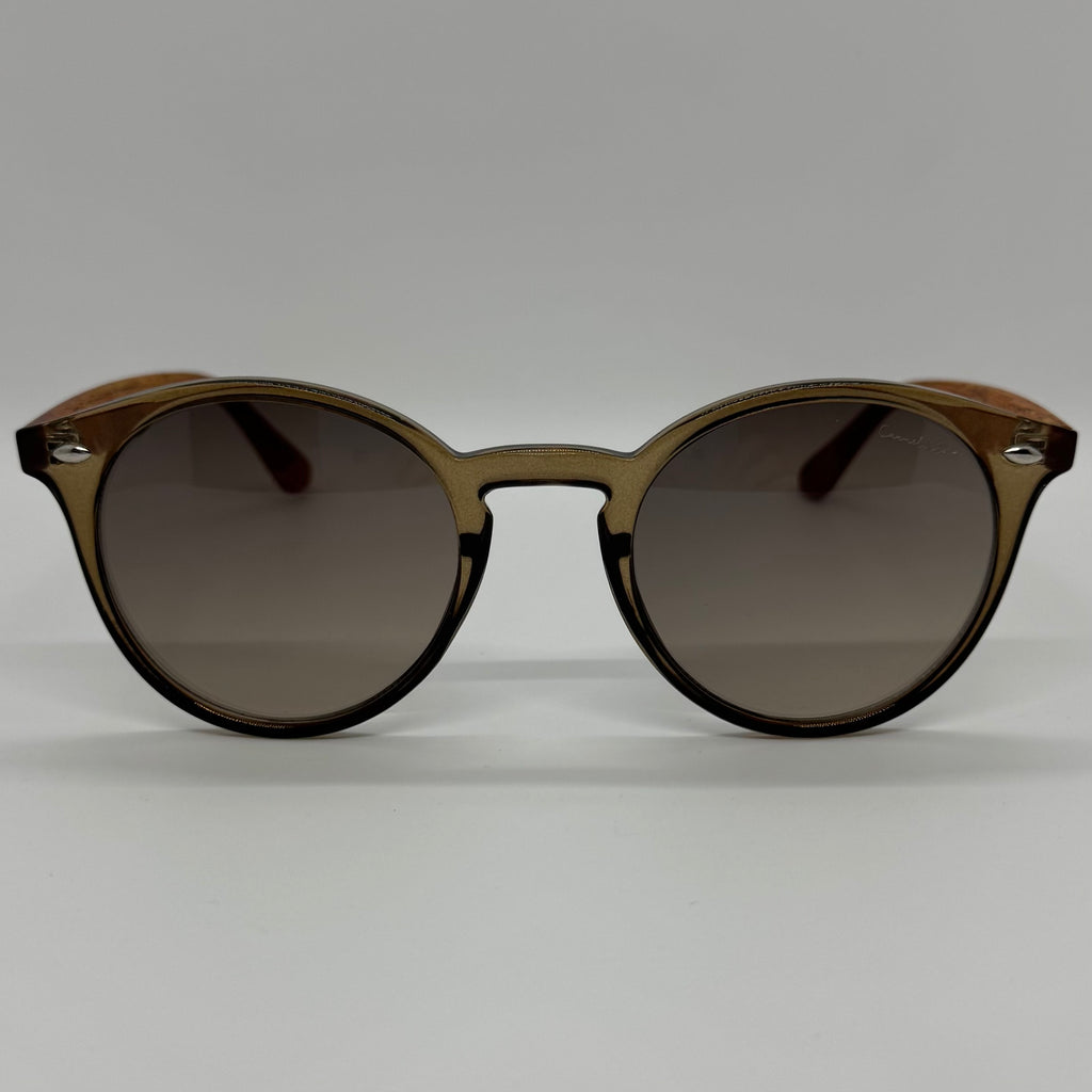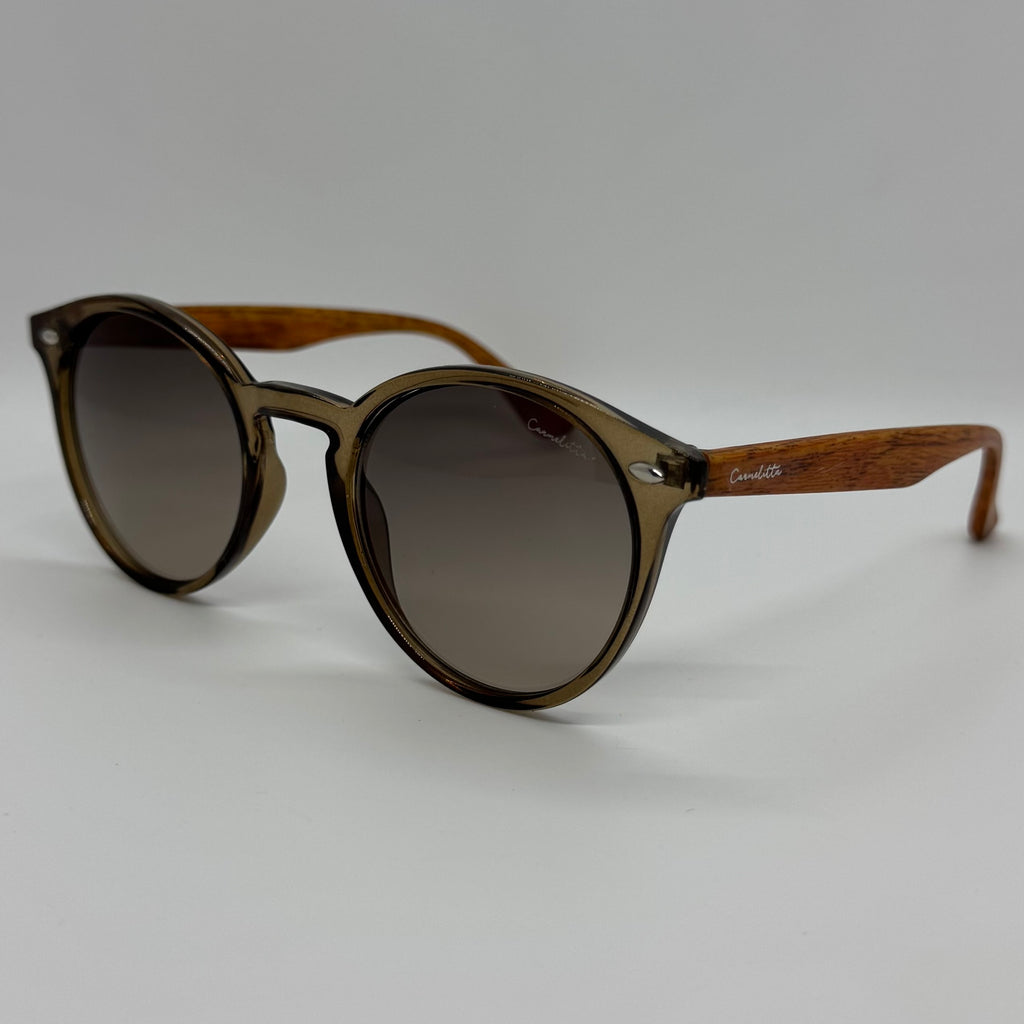 Óculos com hastes em bambu com frente em acetato marrom translúcido e lente fume degrade.