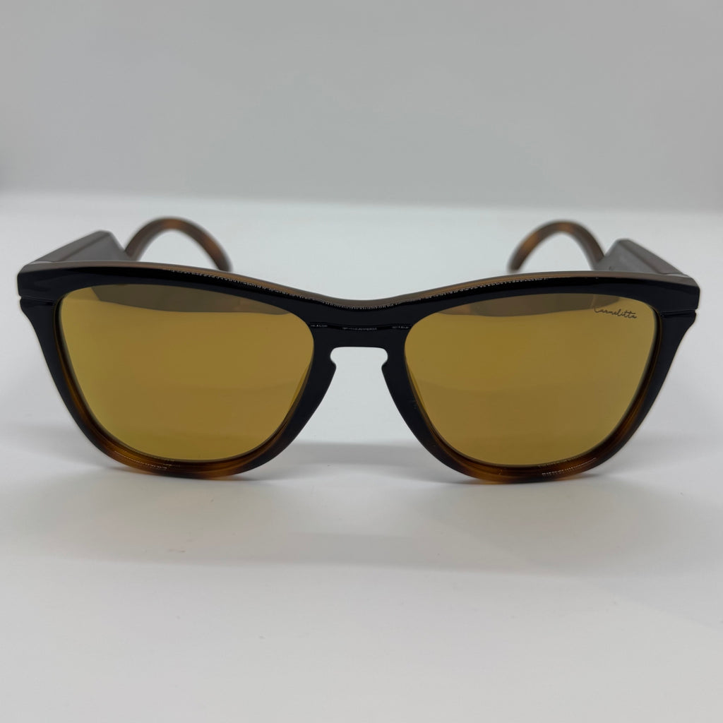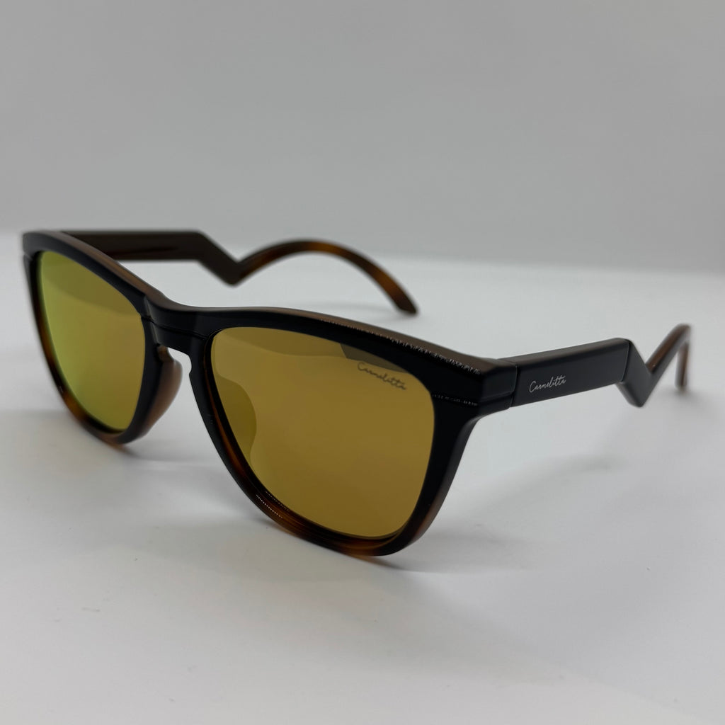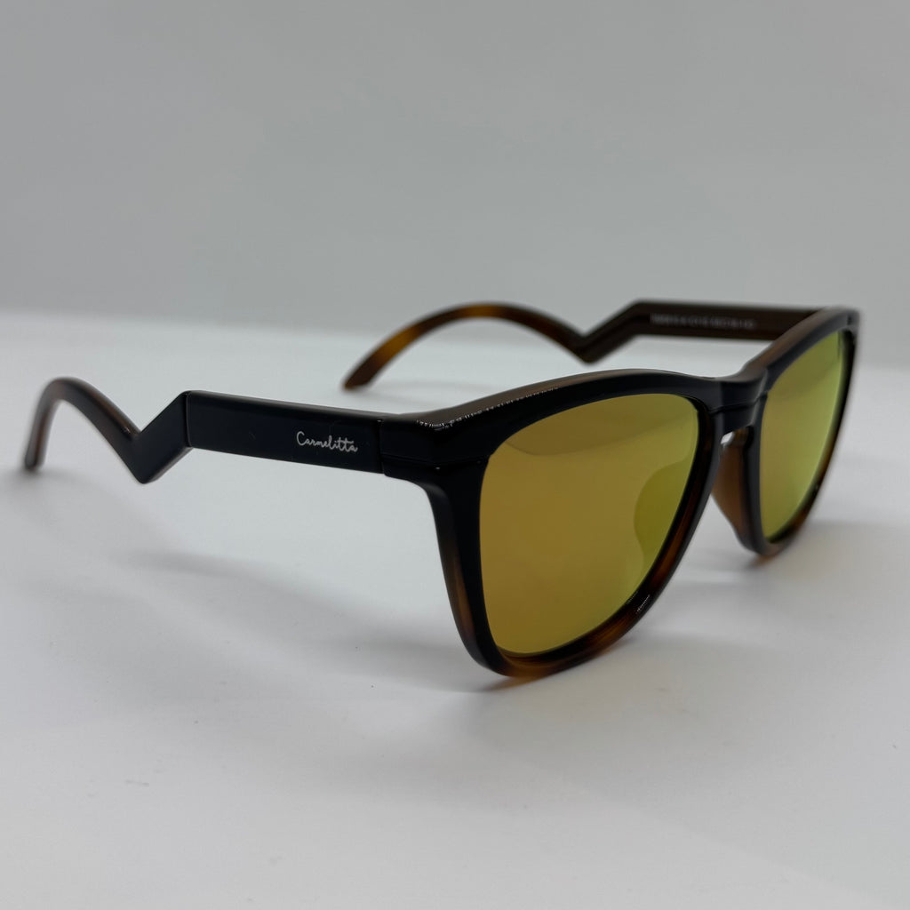 Óculos com hastes em acetato marrom com lente espalhada amarela.