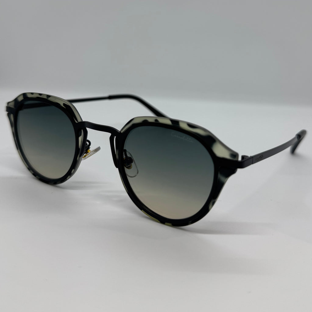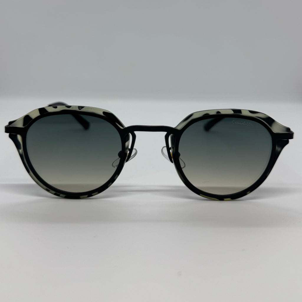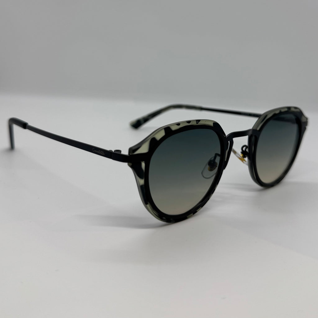Óculos com hastes em mental preto, frente em acetato fosco camuflado e lente fume degrade.