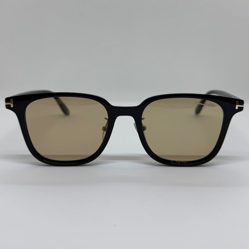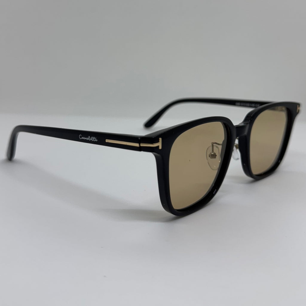 Óculos com hastes em acetato preto, detalhes dourado e lente marrom.
