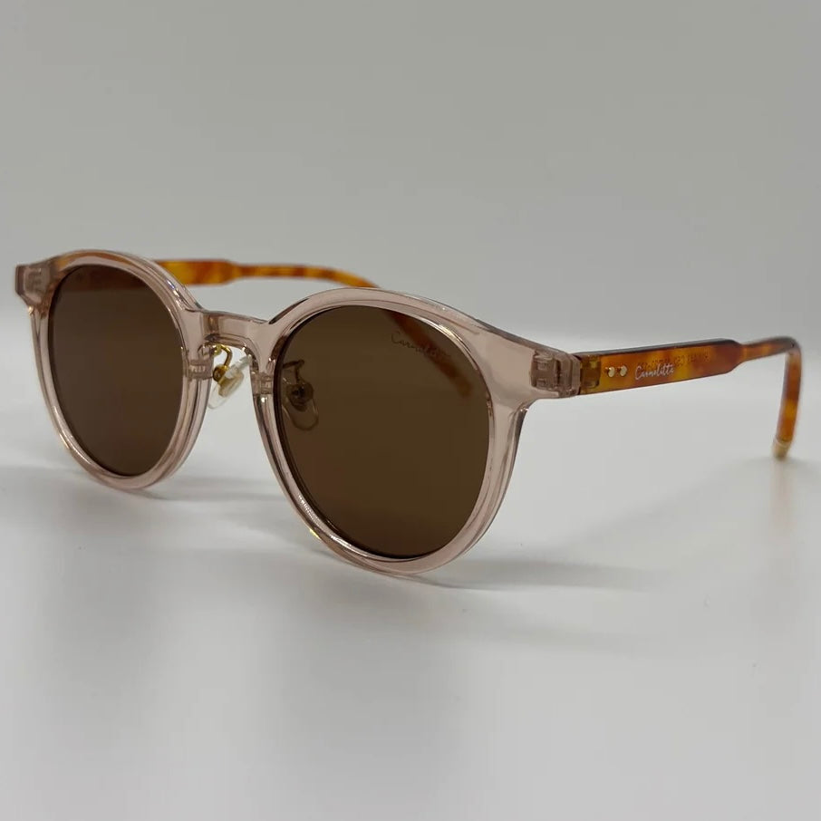 Óculos com hastes em acetato jaguar, com frente rose e lente marrom.