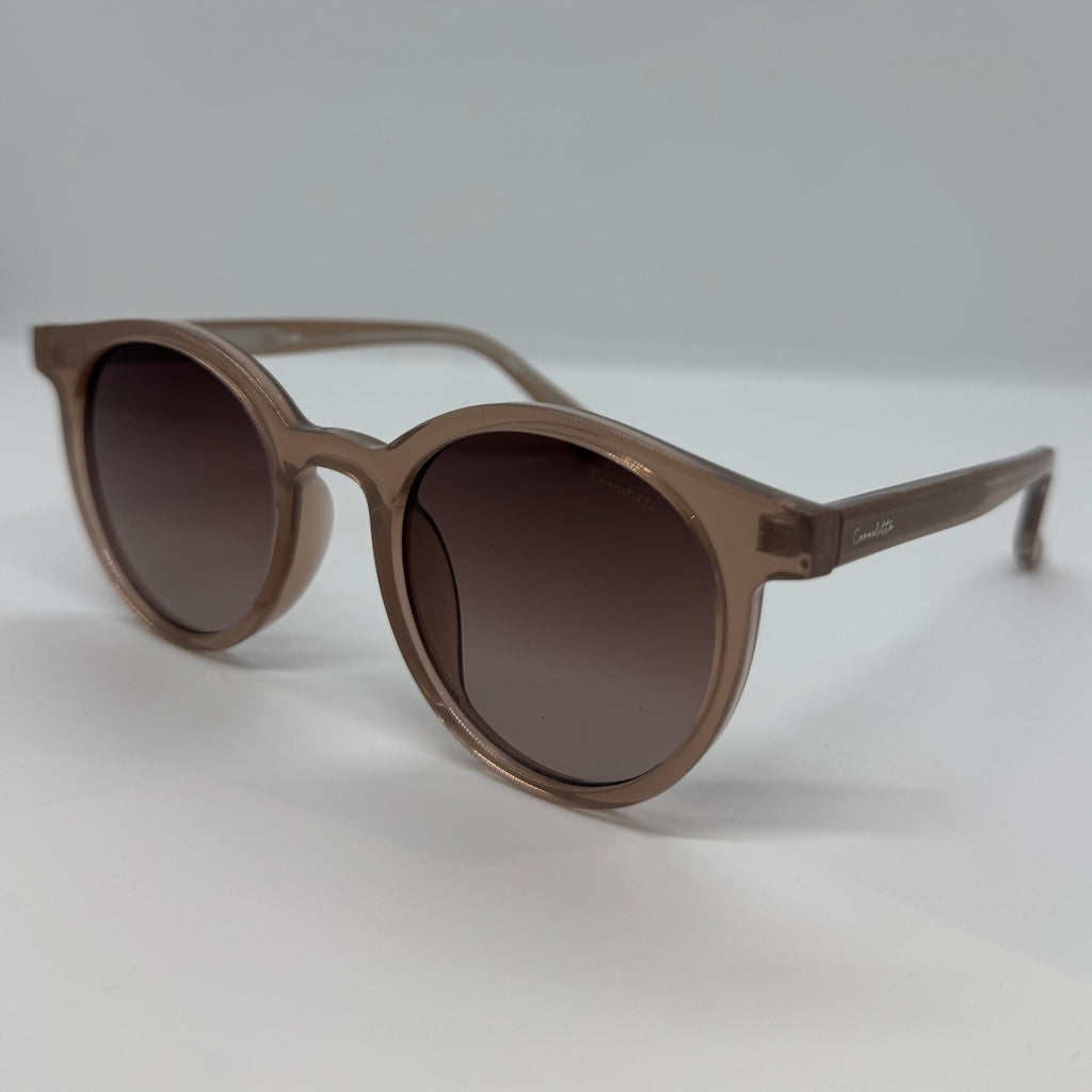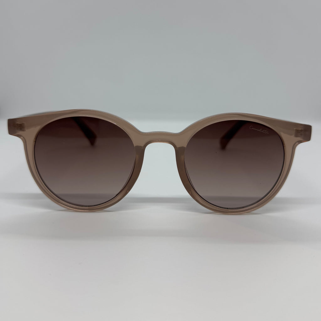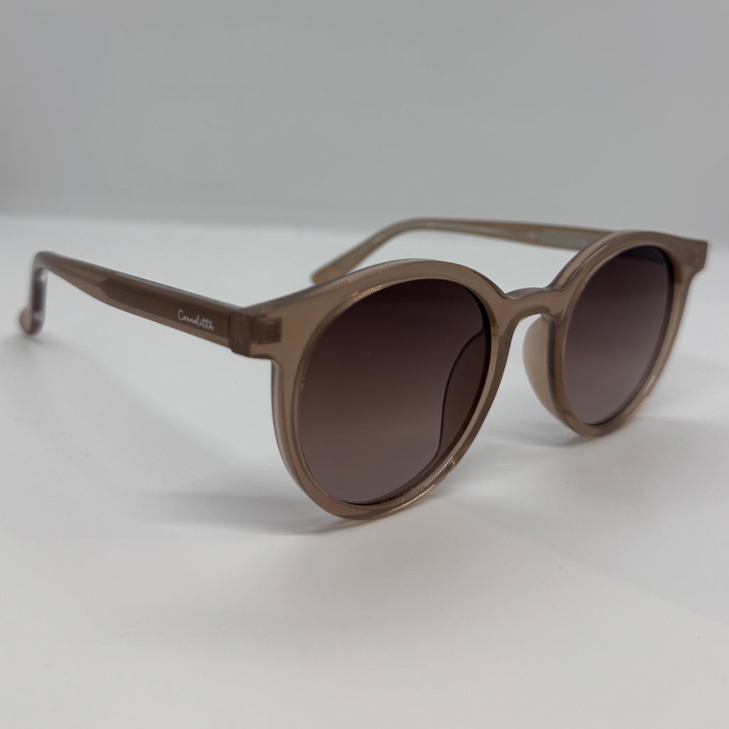 Óculos com hastes em acetato nude com lente roxa degrade.