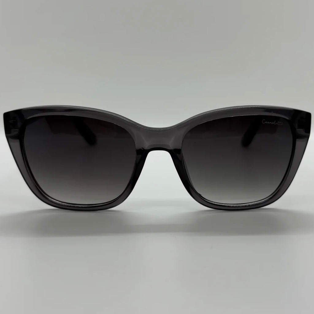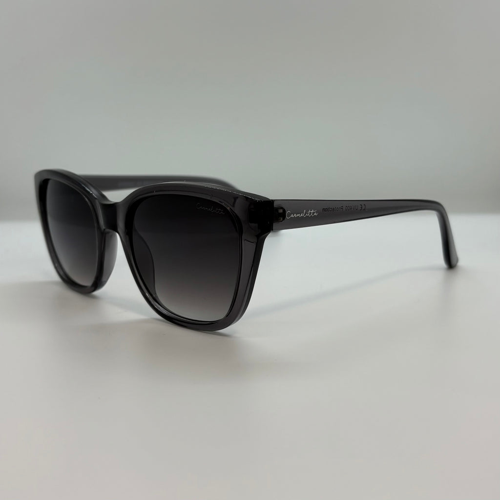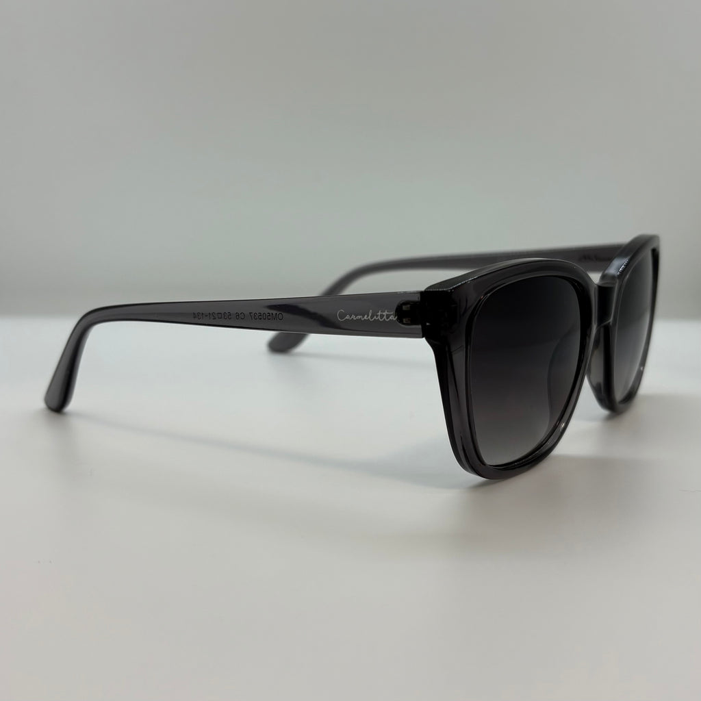 Óculos com armação e hastes cinza translúcido em acetato, e lentes fume degradê.