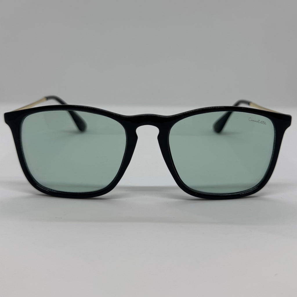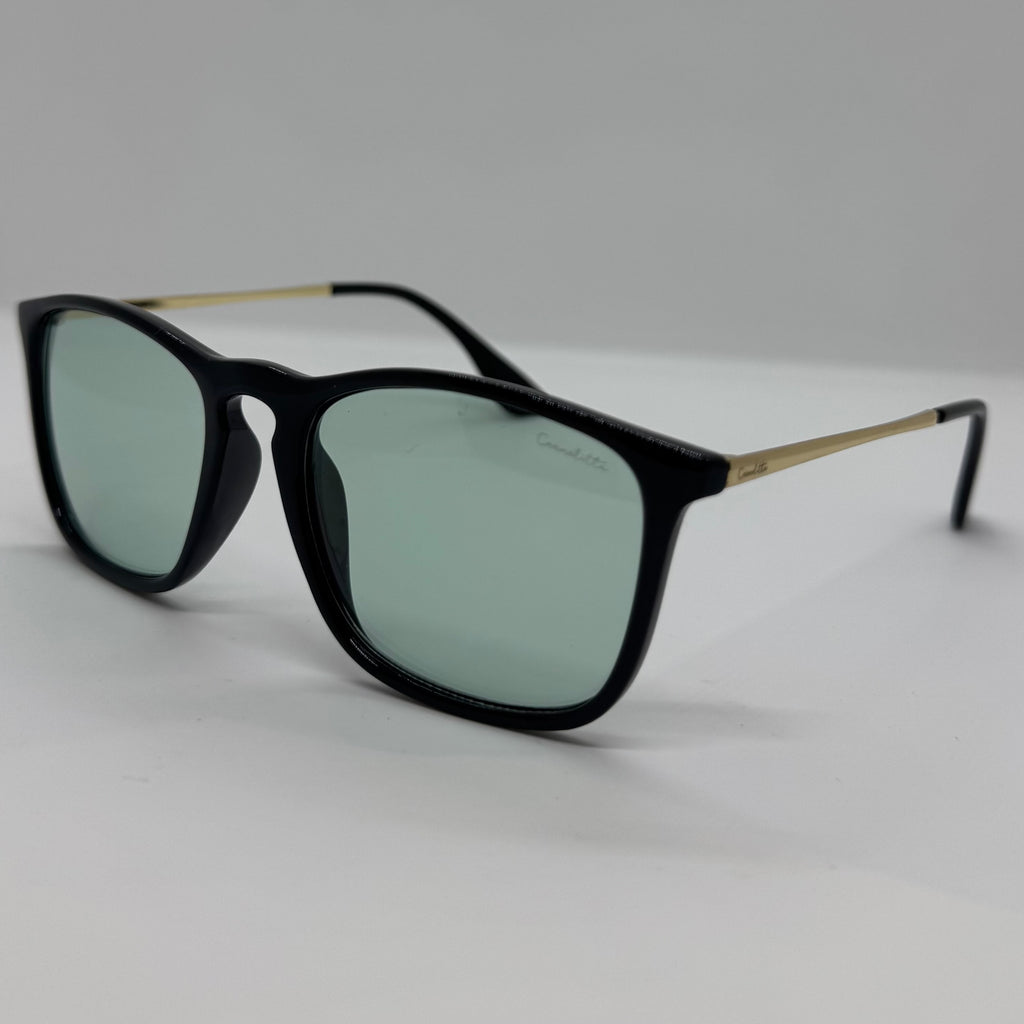 Óculos com hastes em metal, frente em acetato preto com lente verde.