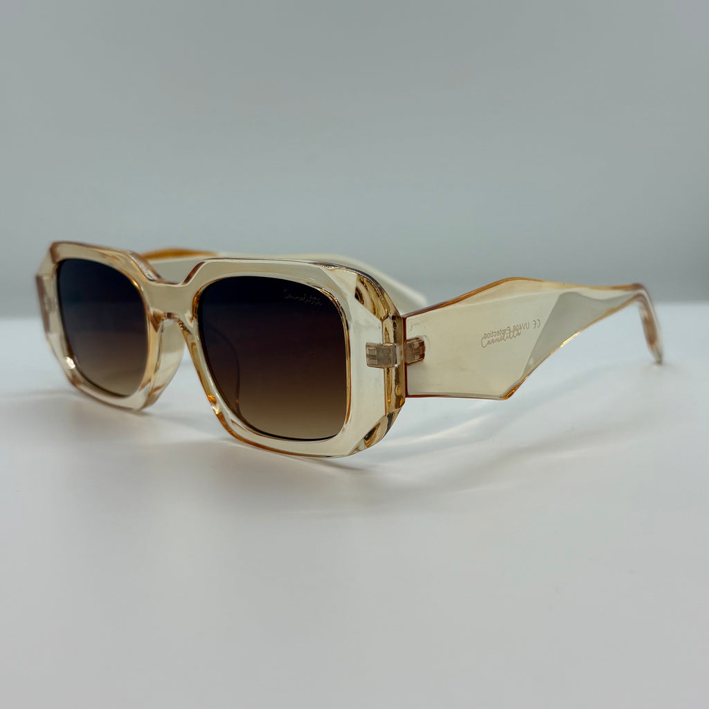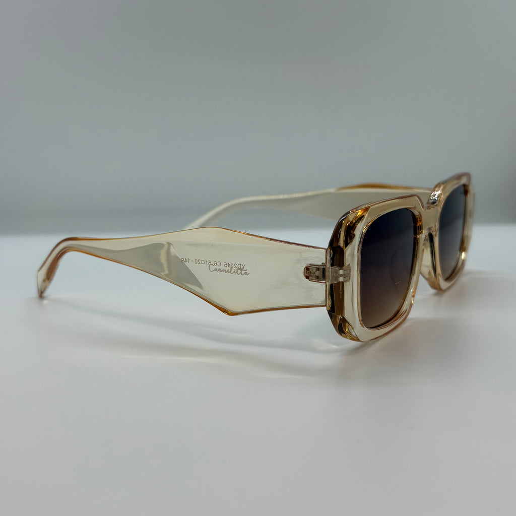 óculos bege translúcido com armação em acetato, e lente degradê marrom.