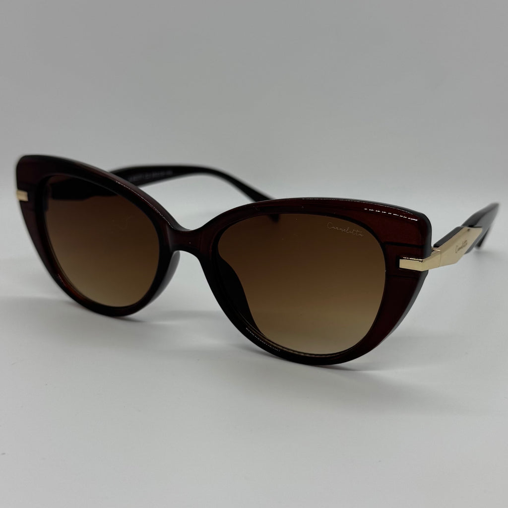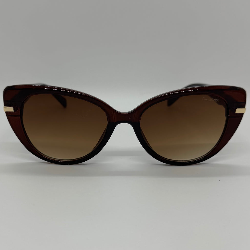Óculos com hastes em metal dourado com frente em acetato marrom e lente marrom degrade.
