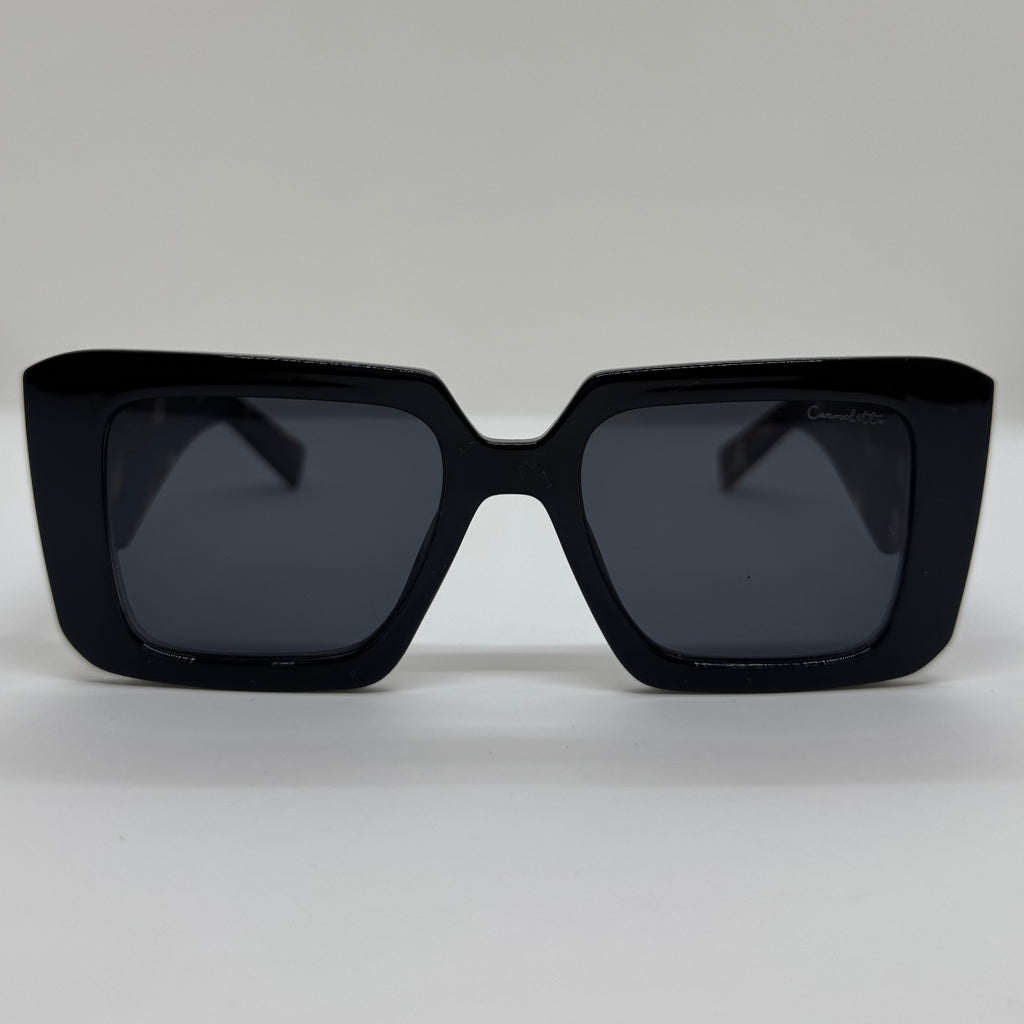 Óculos com armação preto em acetato, hastes estilo tartaruga e lentes preta.