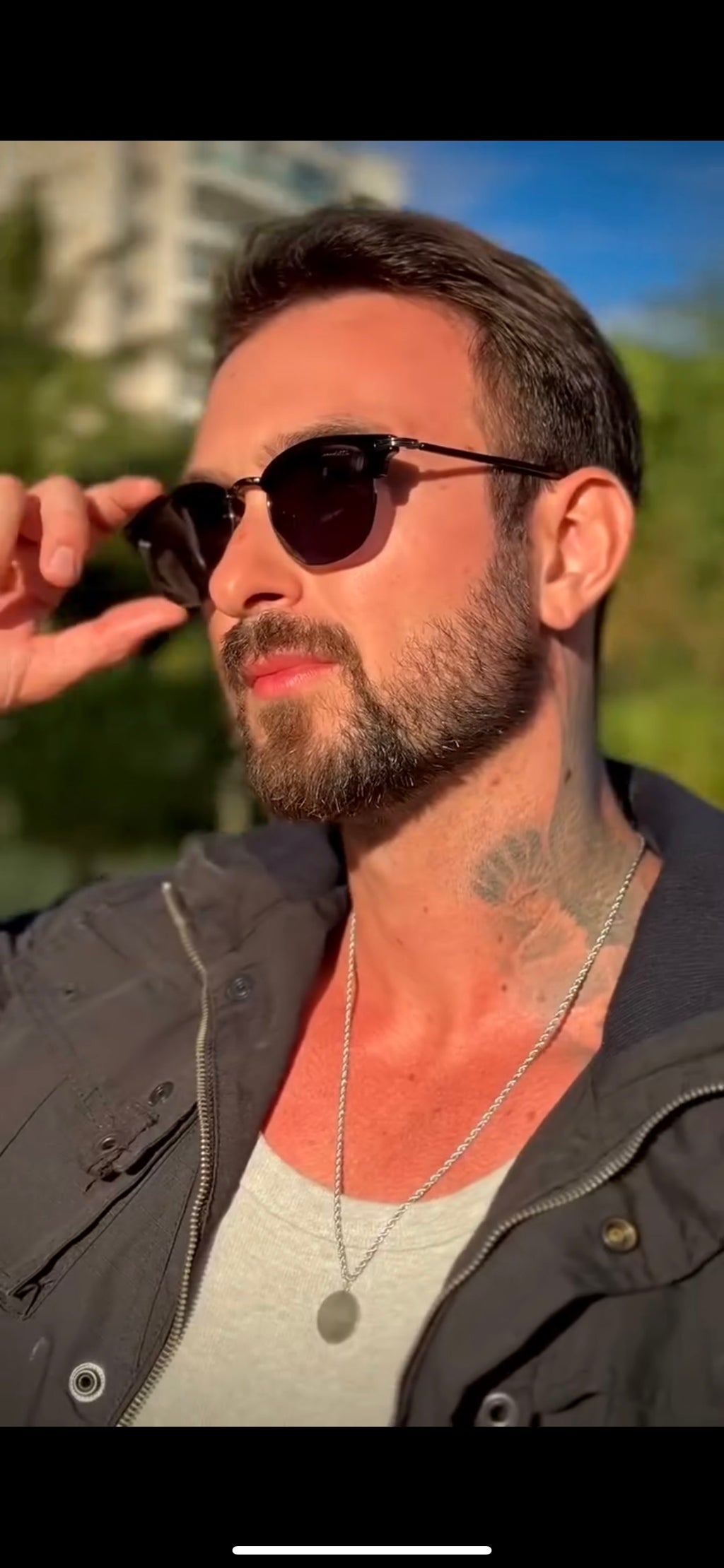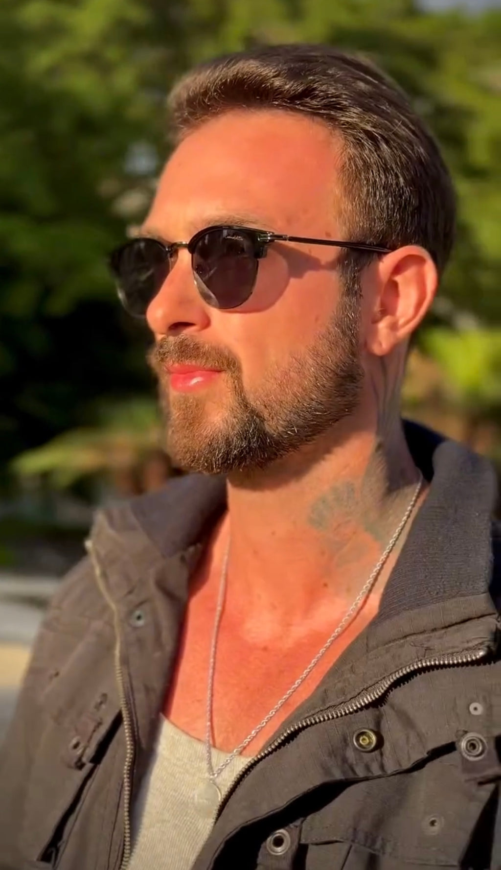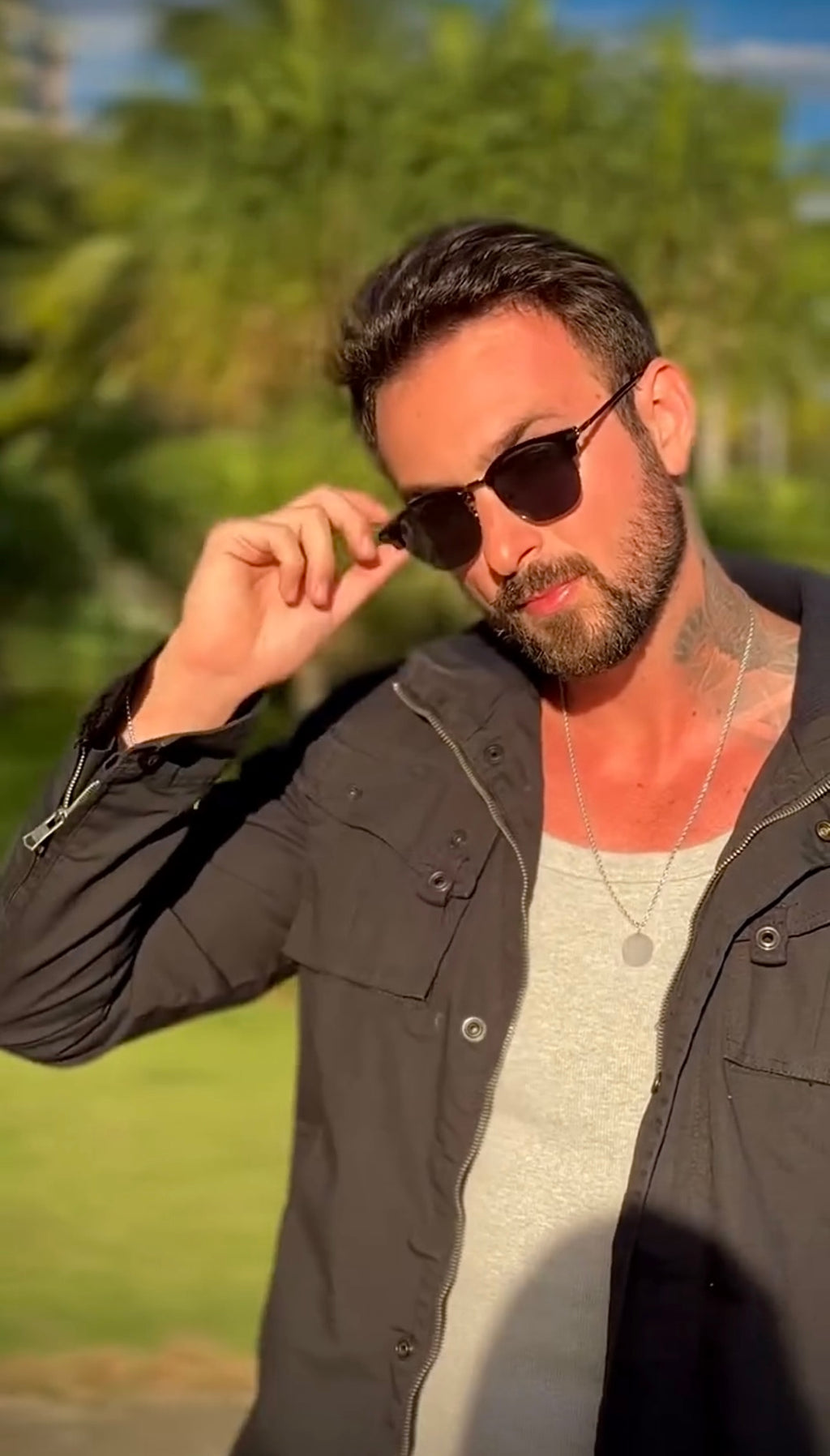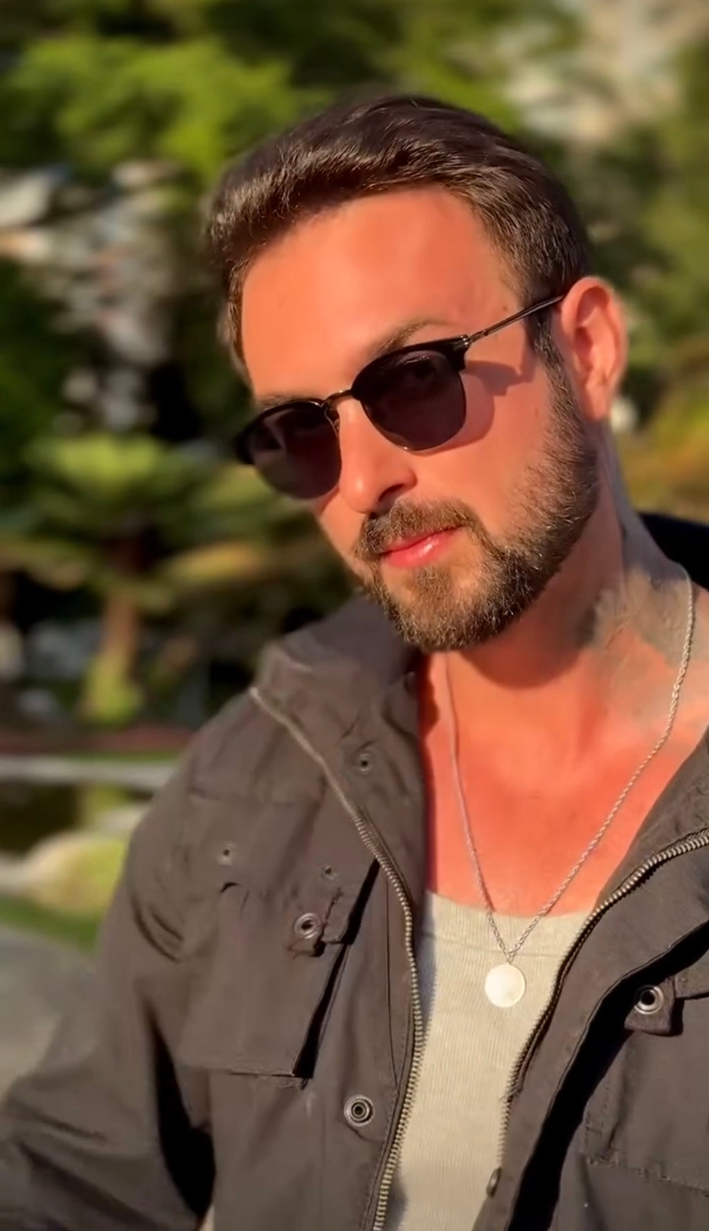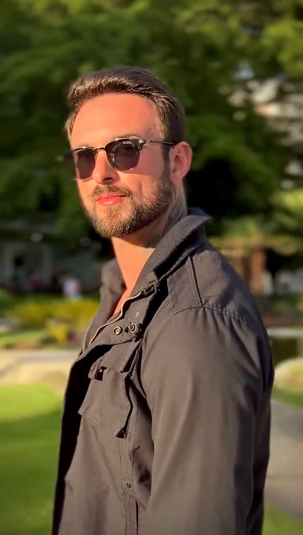 Óculos com hastes em metal preto com lente verde.