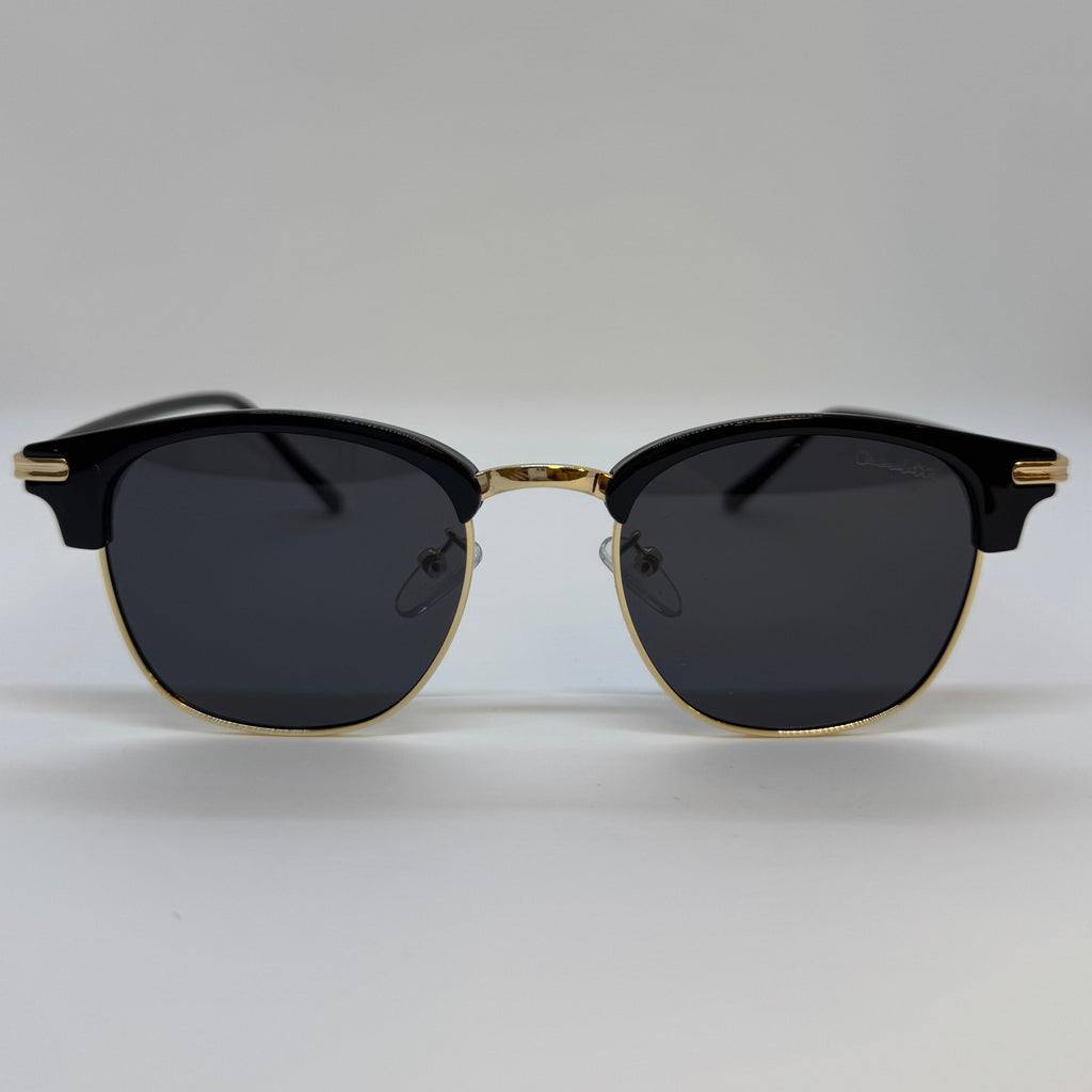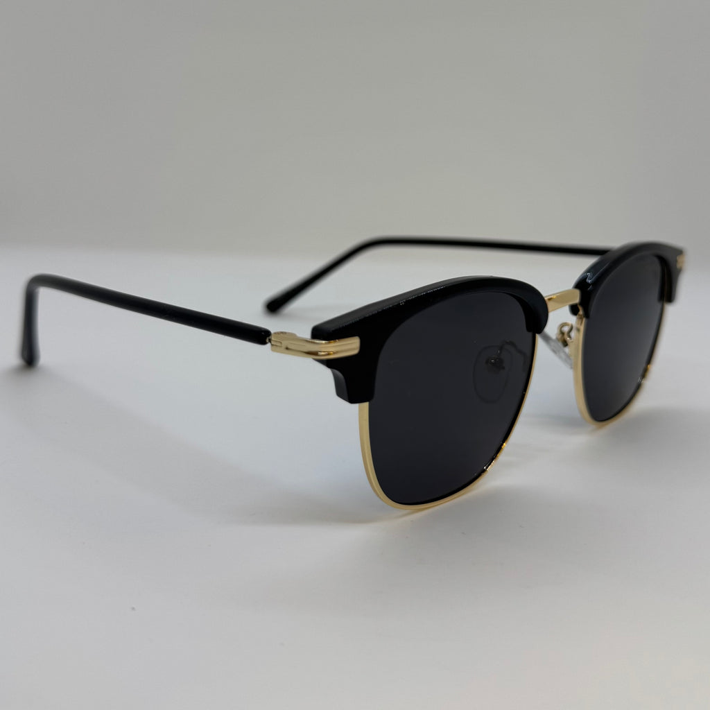 Óculos com hastes em acetato preto, frente e metal dourado com acetato preto e lente preta.