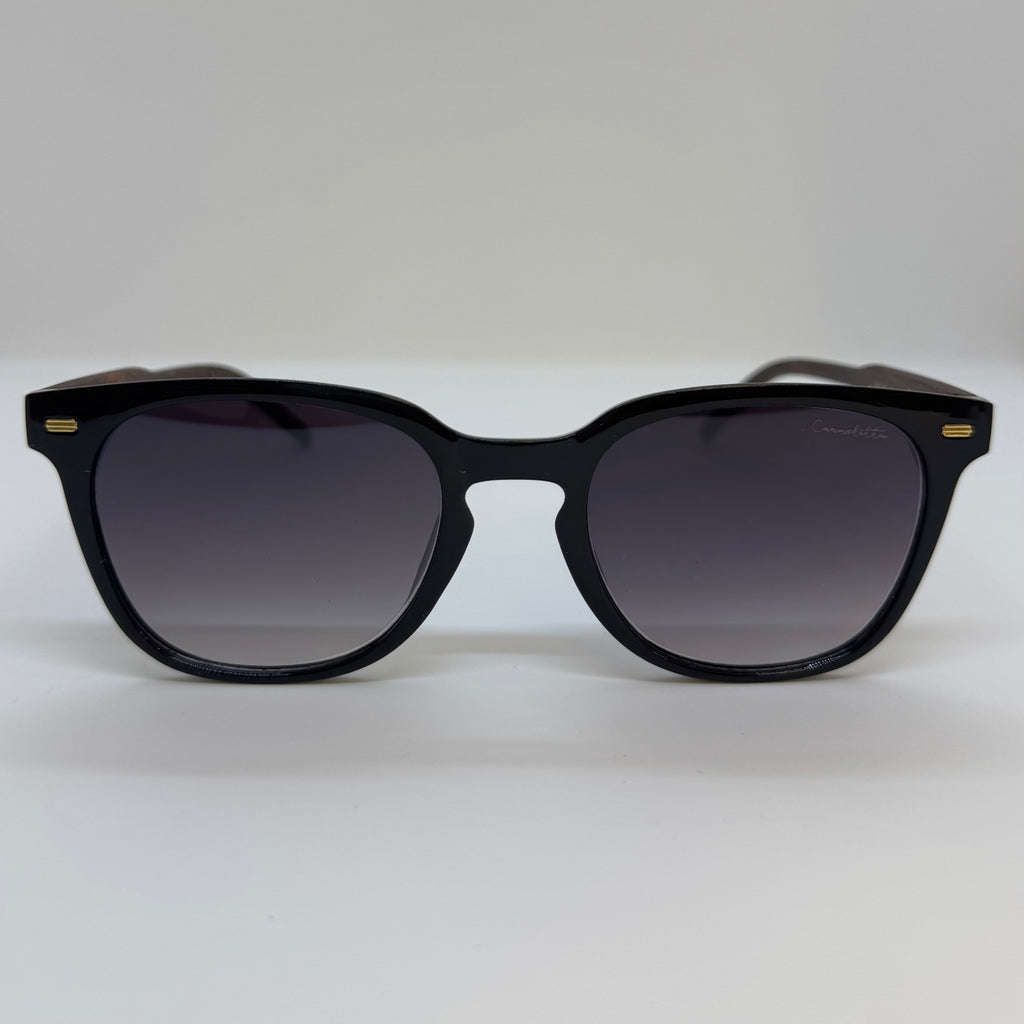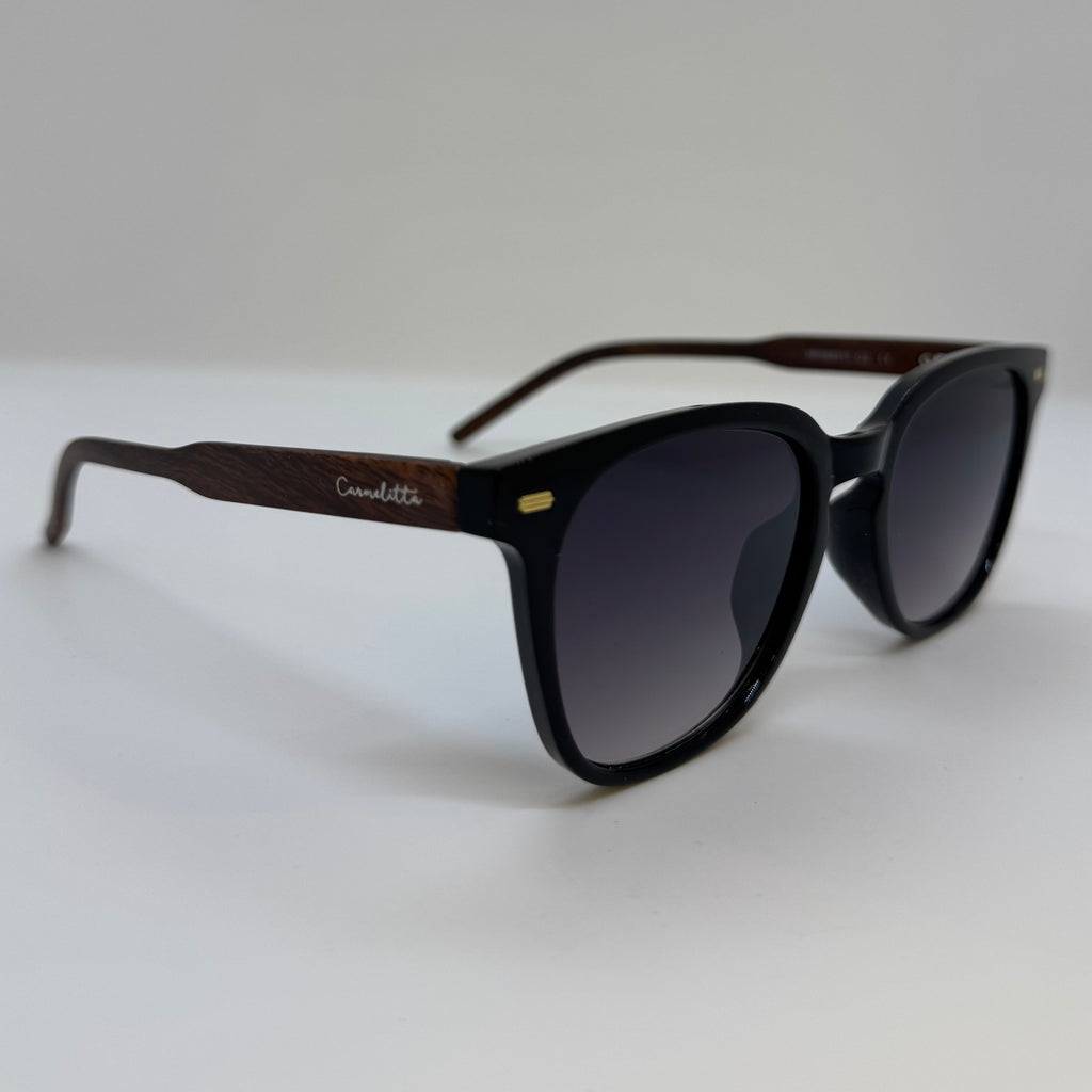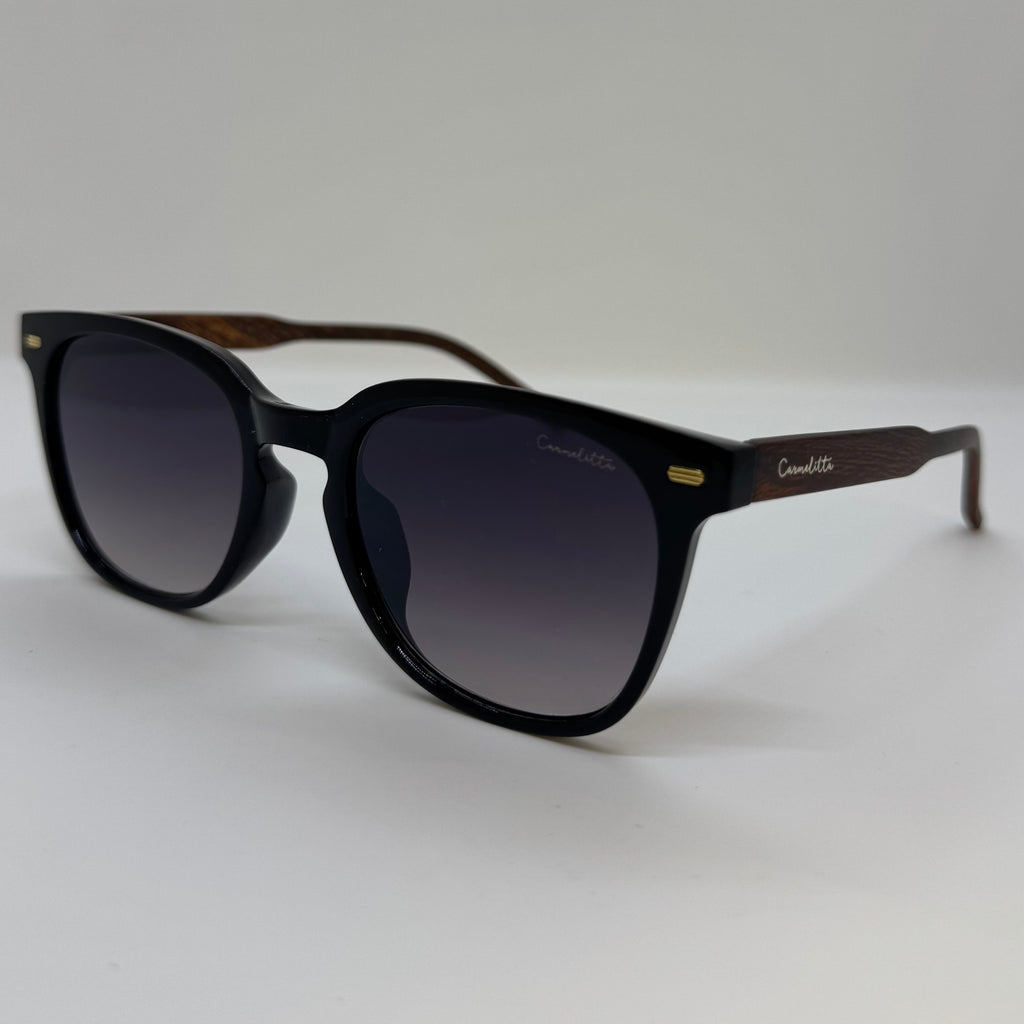 Óculos com hastes sem bambu escuro, frente em acetato preto fosco com lente roxa degrade.