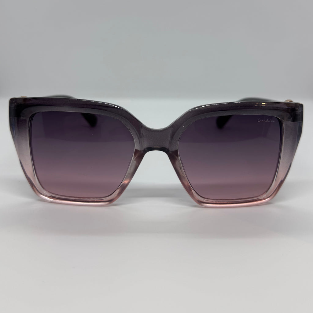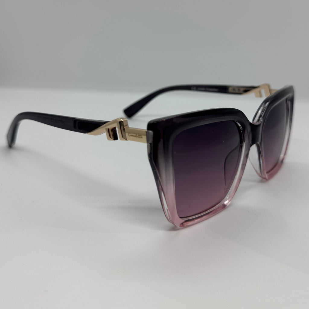Óculos com hastes em acetato cinza degrade com detalhe dourado e lente roxa degrade.