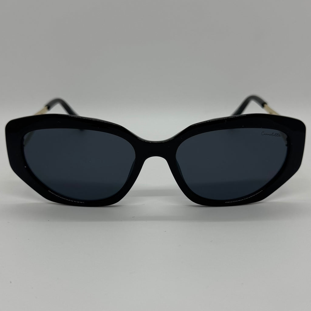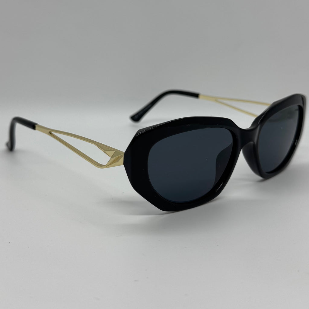 Óculos com hastes em metal dourado com frente em acetato preto e lente preta.