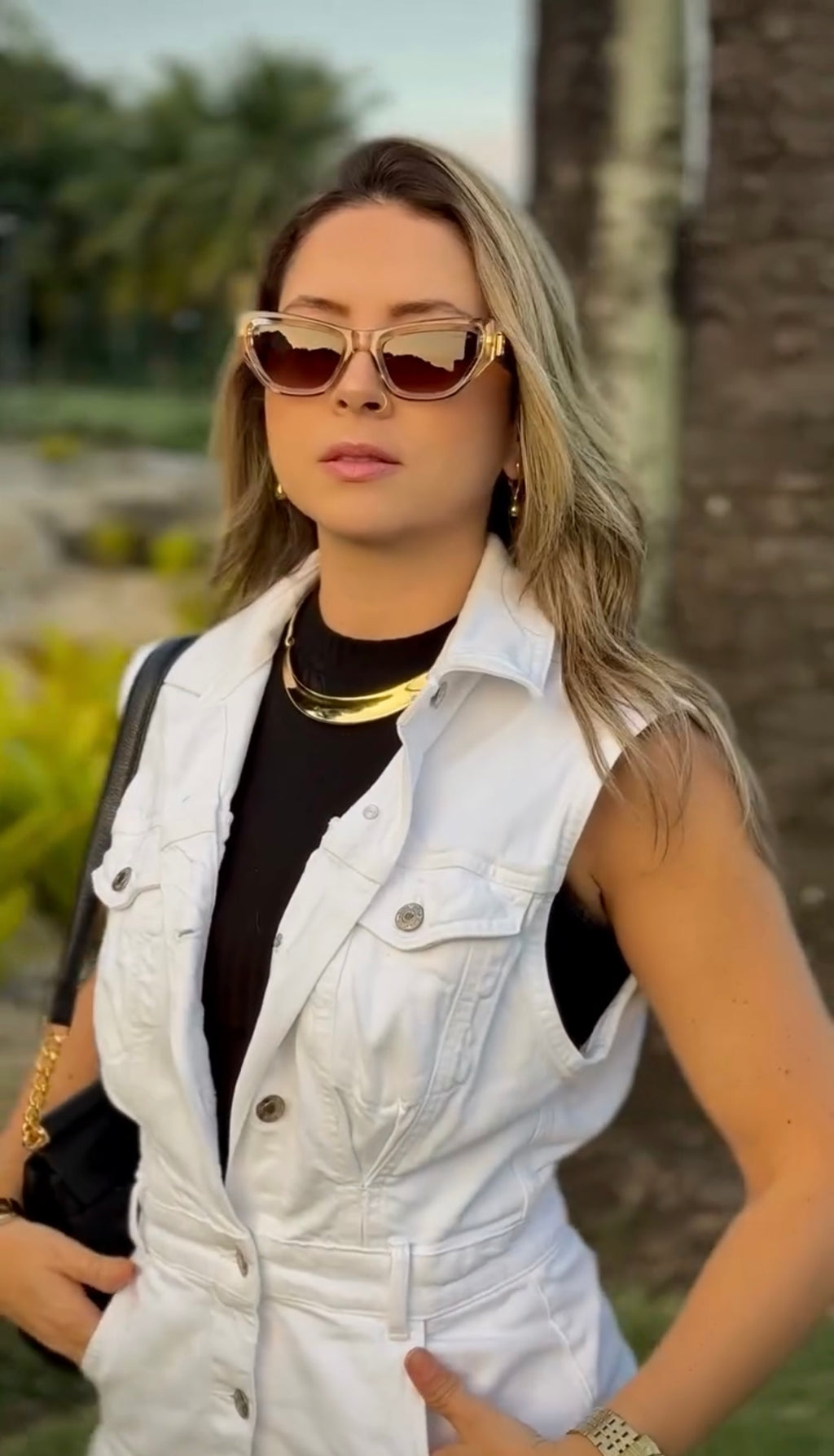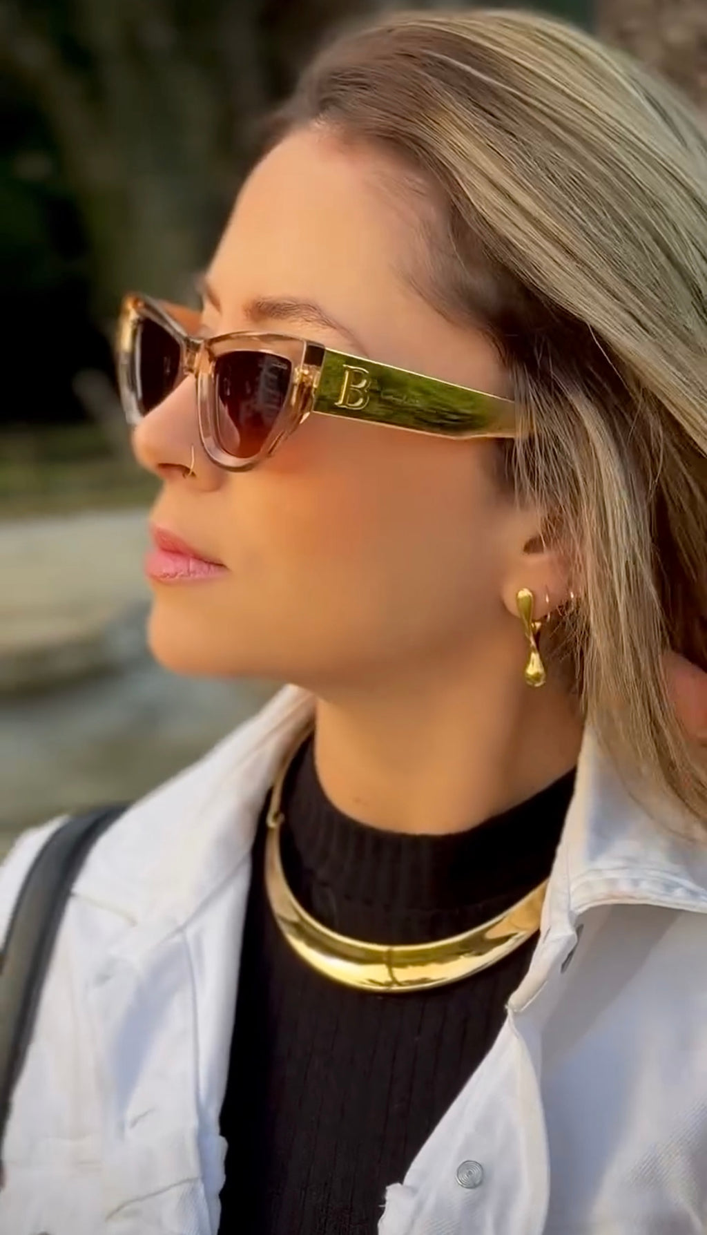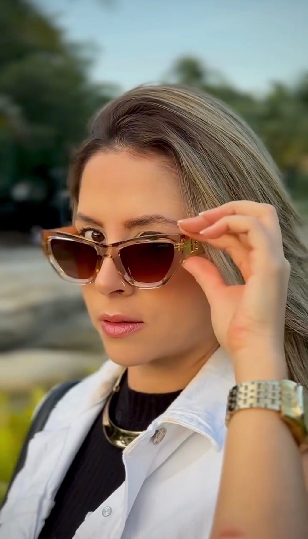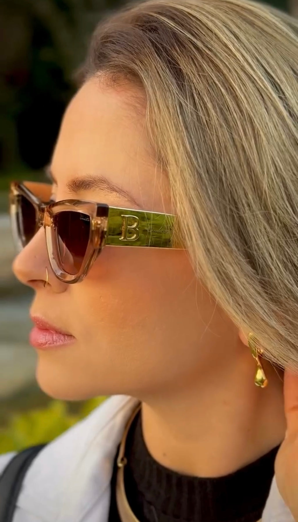 Óculos com hastes em metal dourado, frente em acetato rose com lente marrom degrade.
