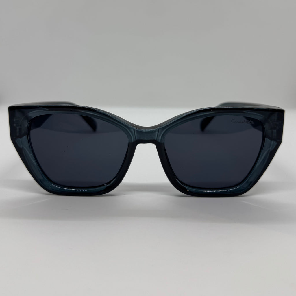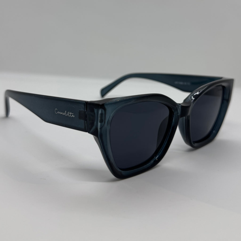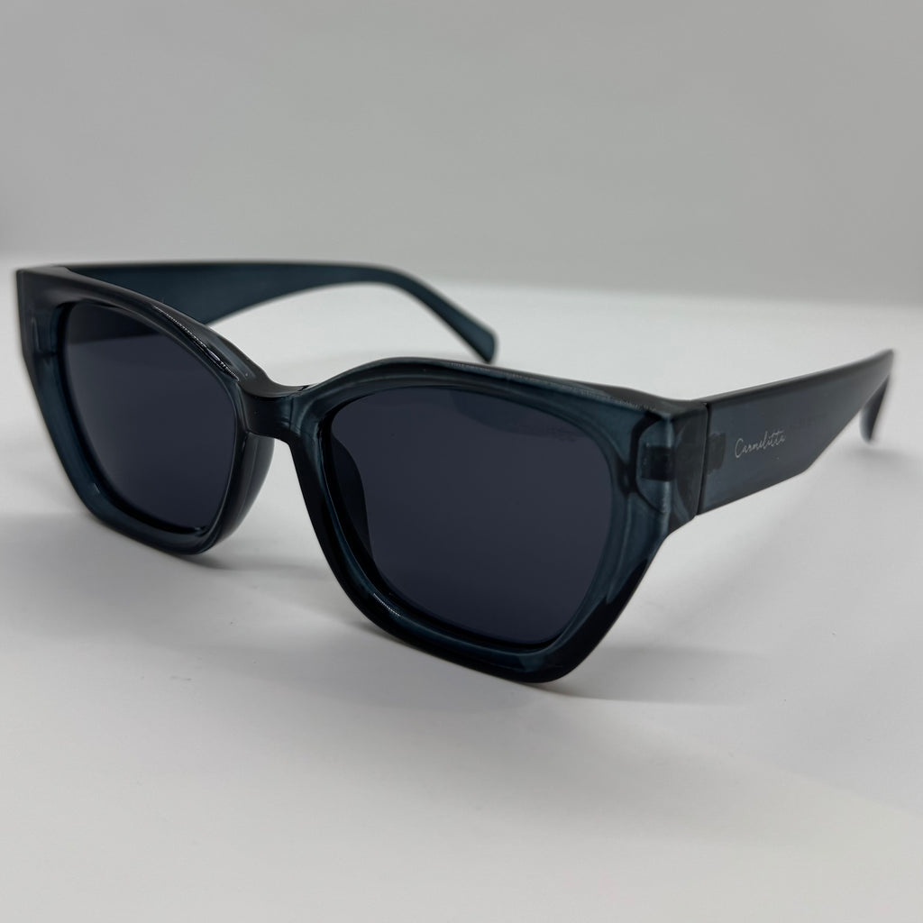 Óculos com hastes em acetato azul marinho translúcido com lente preta.