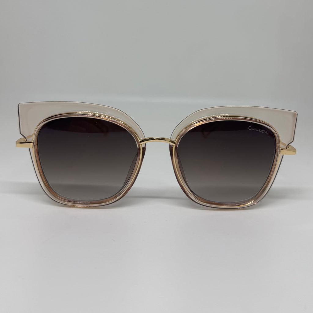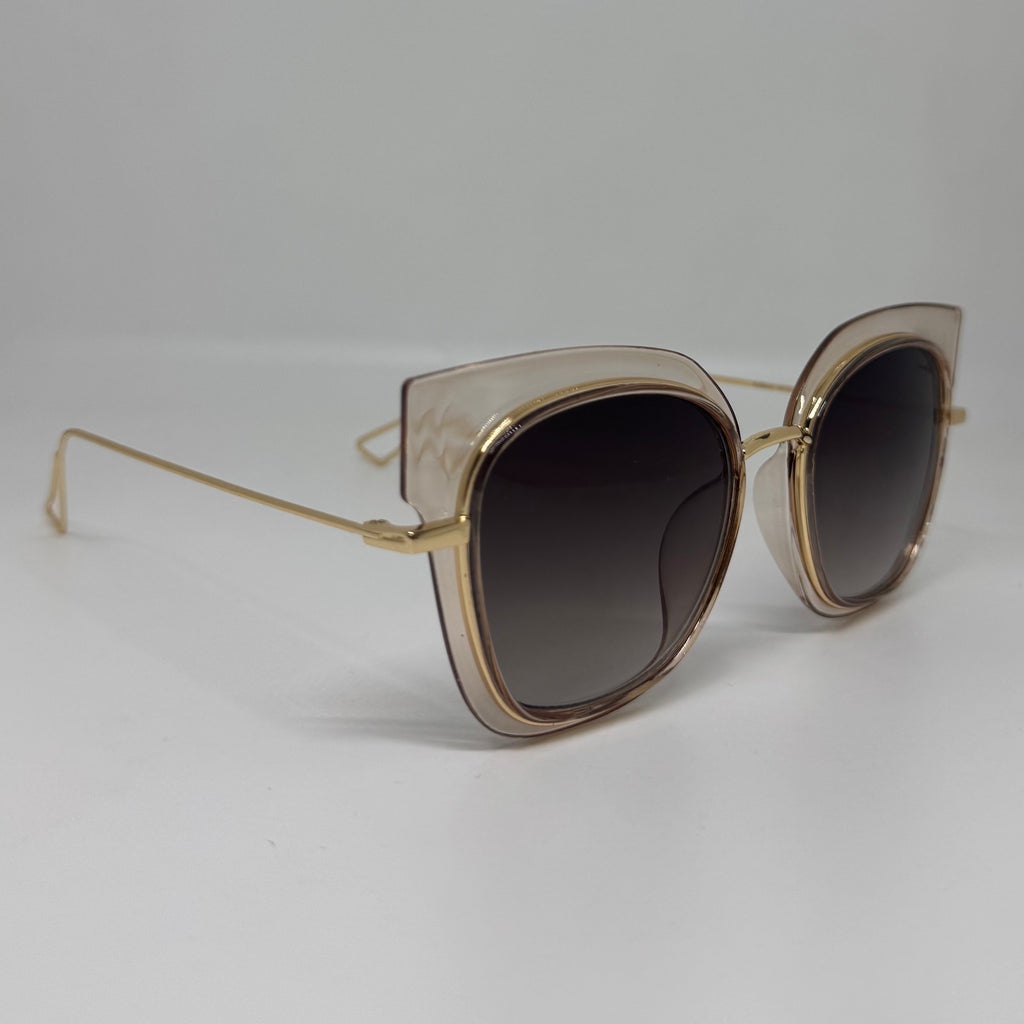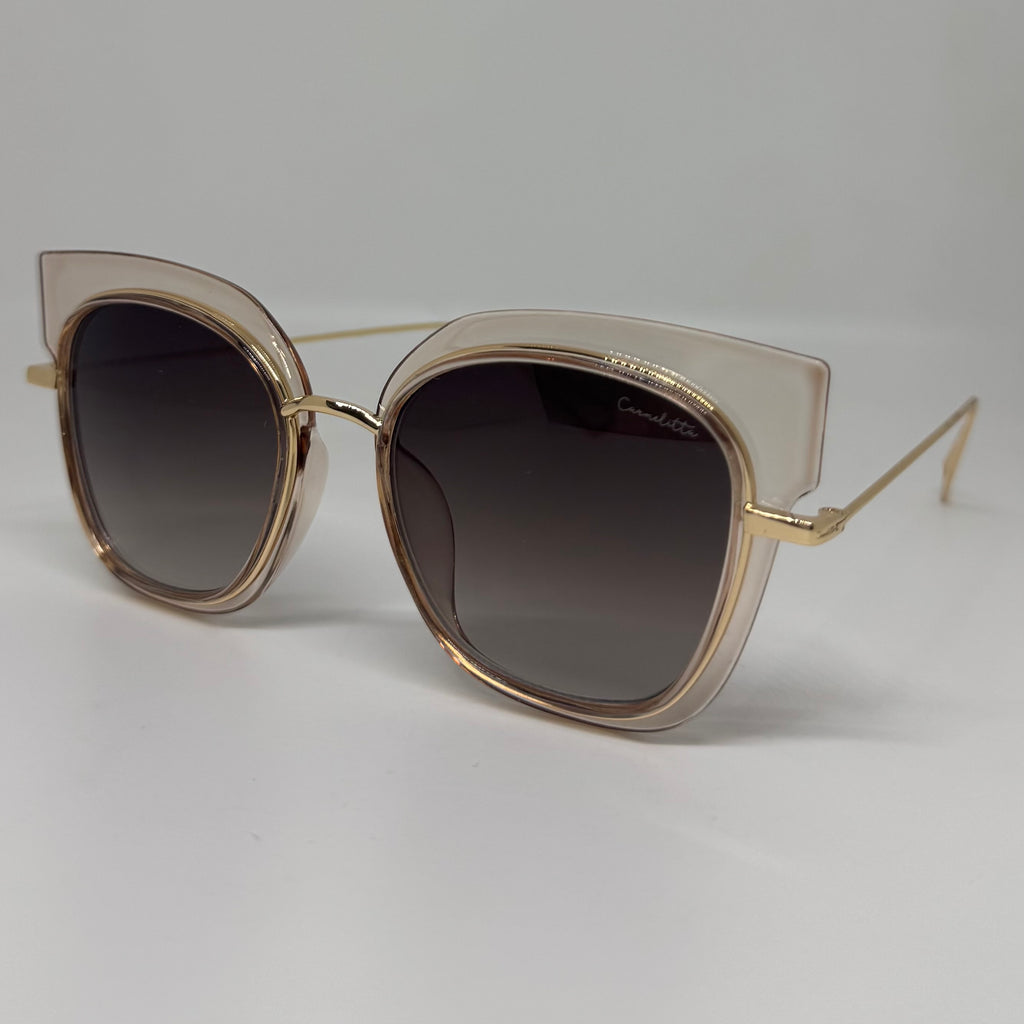 Óculos com hastes em metal dourado, frente em acetato rose translúcido com lente roxa degrade.