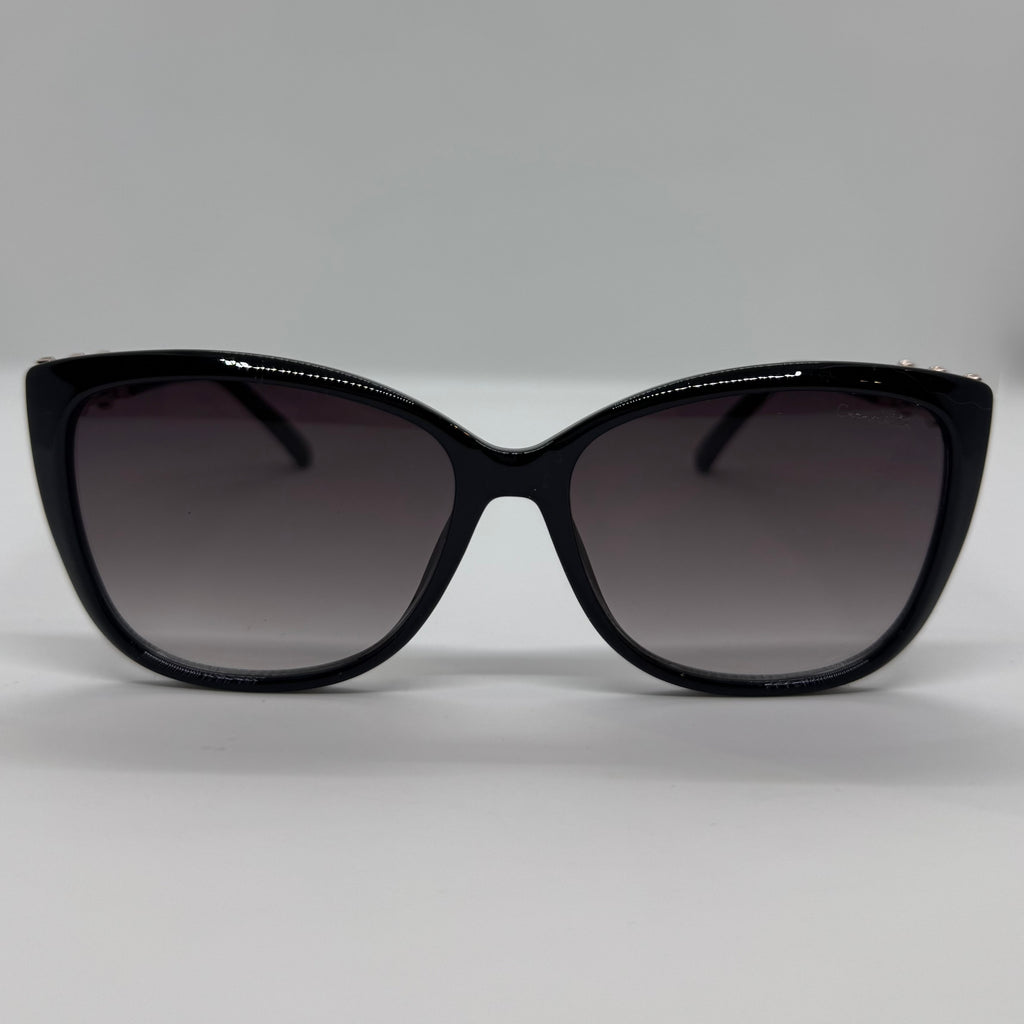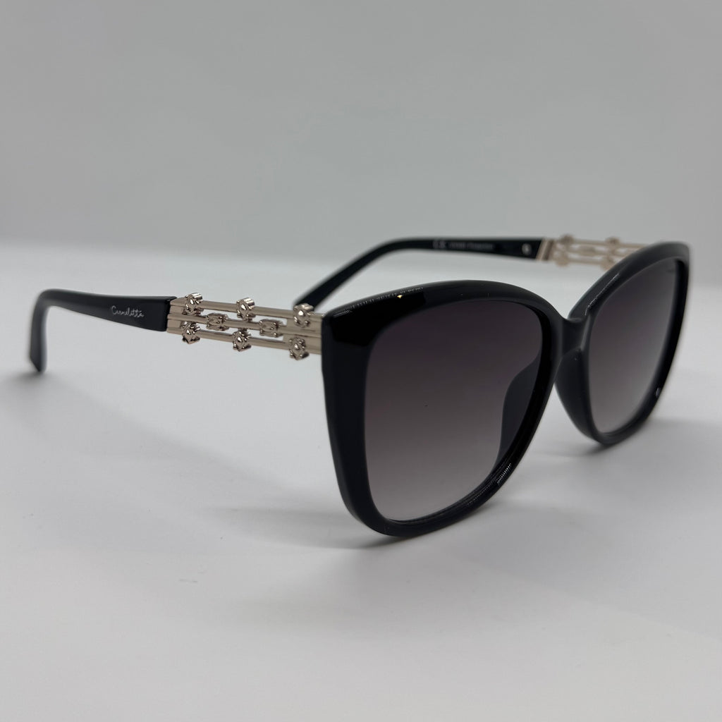 Óculos de hastes com detalhes dourados e frente em acetato preto com lente roxa degrade.
