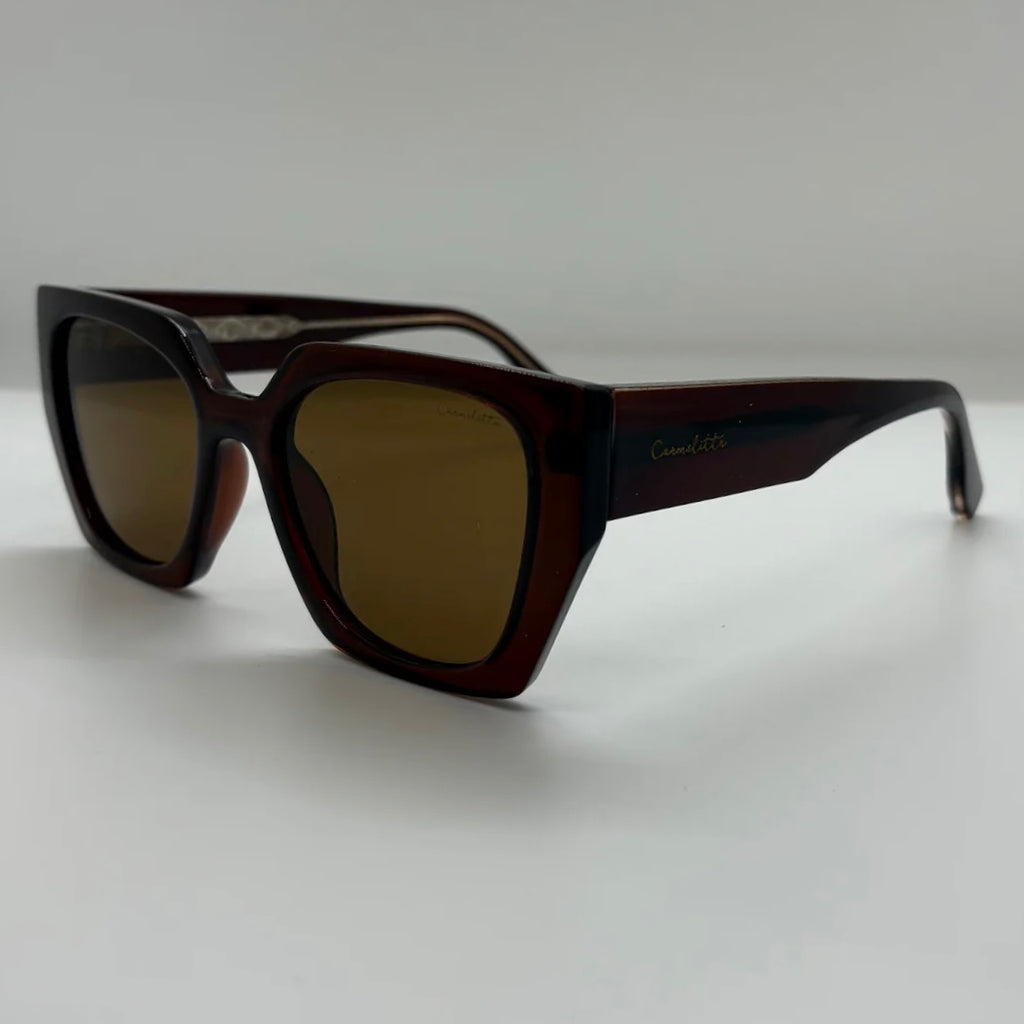 óculos com armação e hastes em marrom escuro,de acetato, e lentes em marrom suave.