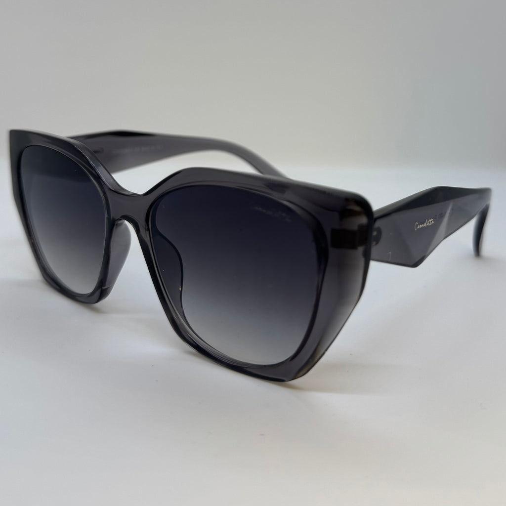 Óculos com hastes em acetato cinza translúcido com lente roxa degrade.