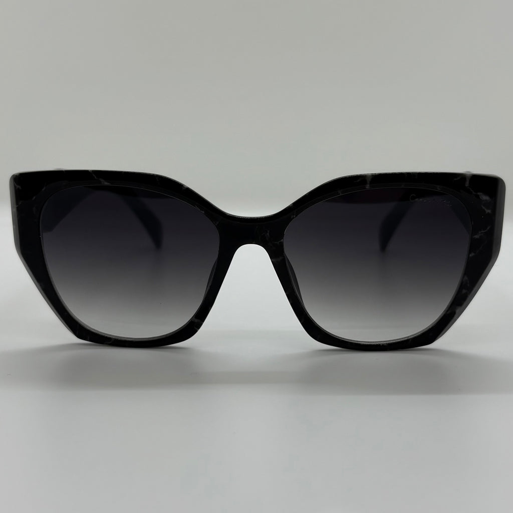 Óculos com armação e hastes preto marmorizado em acetato , lentes fumê degradê.