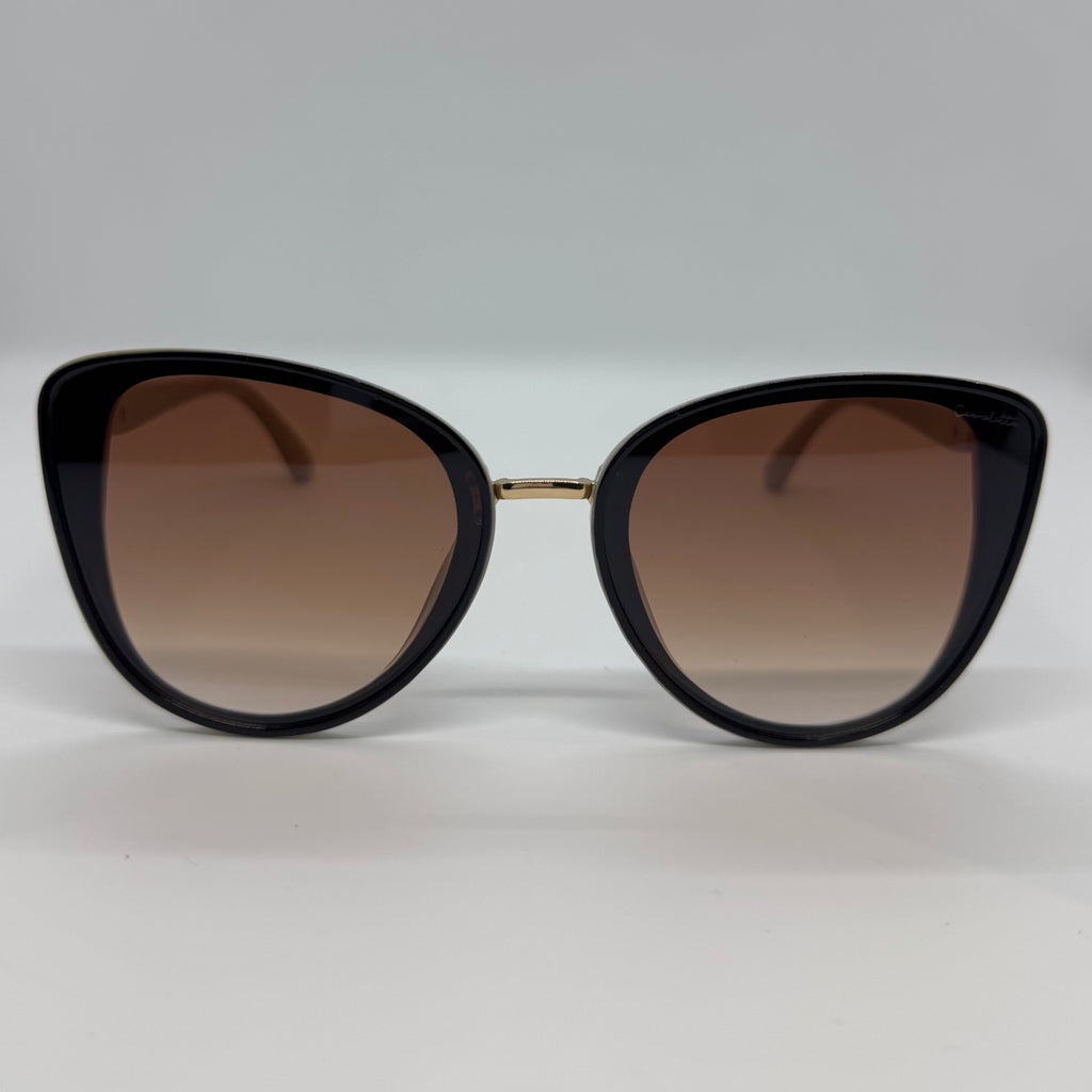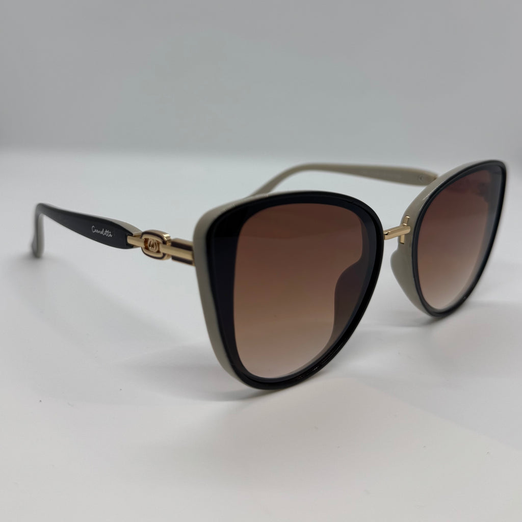 Óculos com hastes em acetato marrom com a parte interior off white, detalhes dourado e lente marrom degrade.