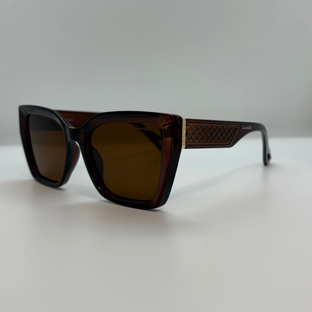 Óculos com armação em acetato na cor marrom translúcido, hastes texturizadas e detalhadas com acabamento dourado discreto e lentes em marrom.