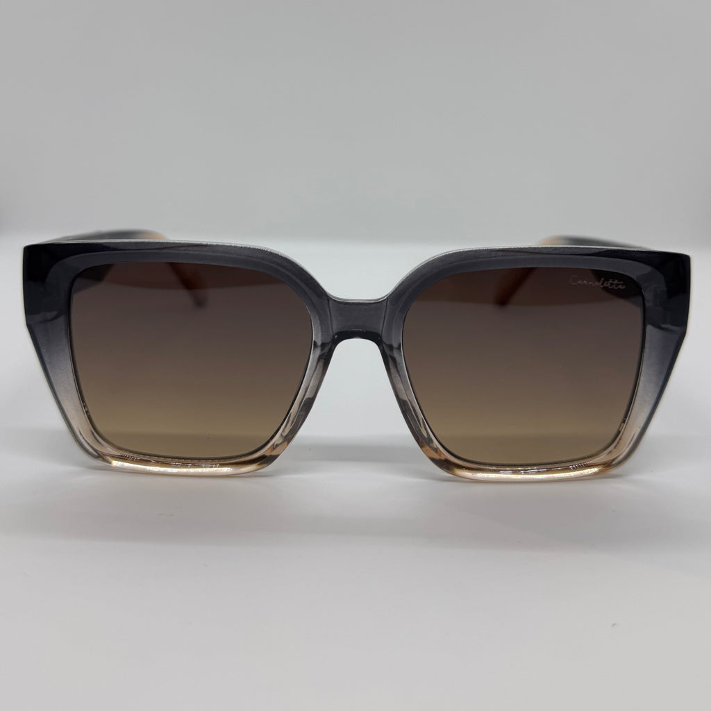 Óculos com hastes cinza degrade translúcido com lente degrade.