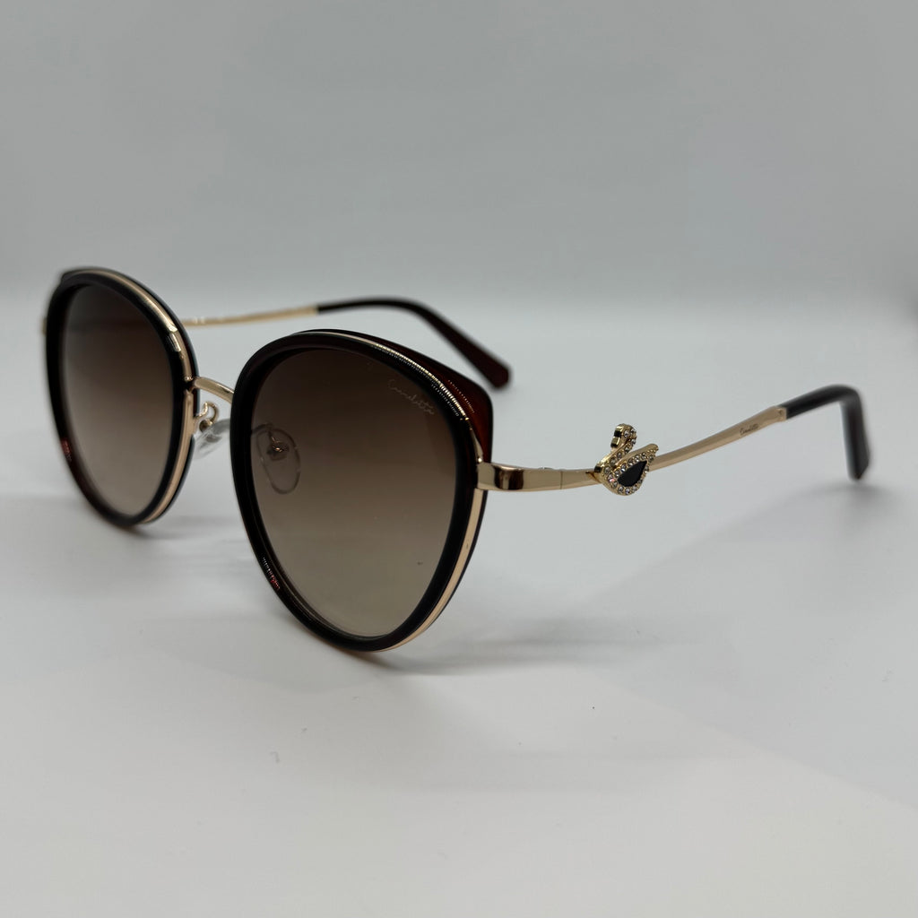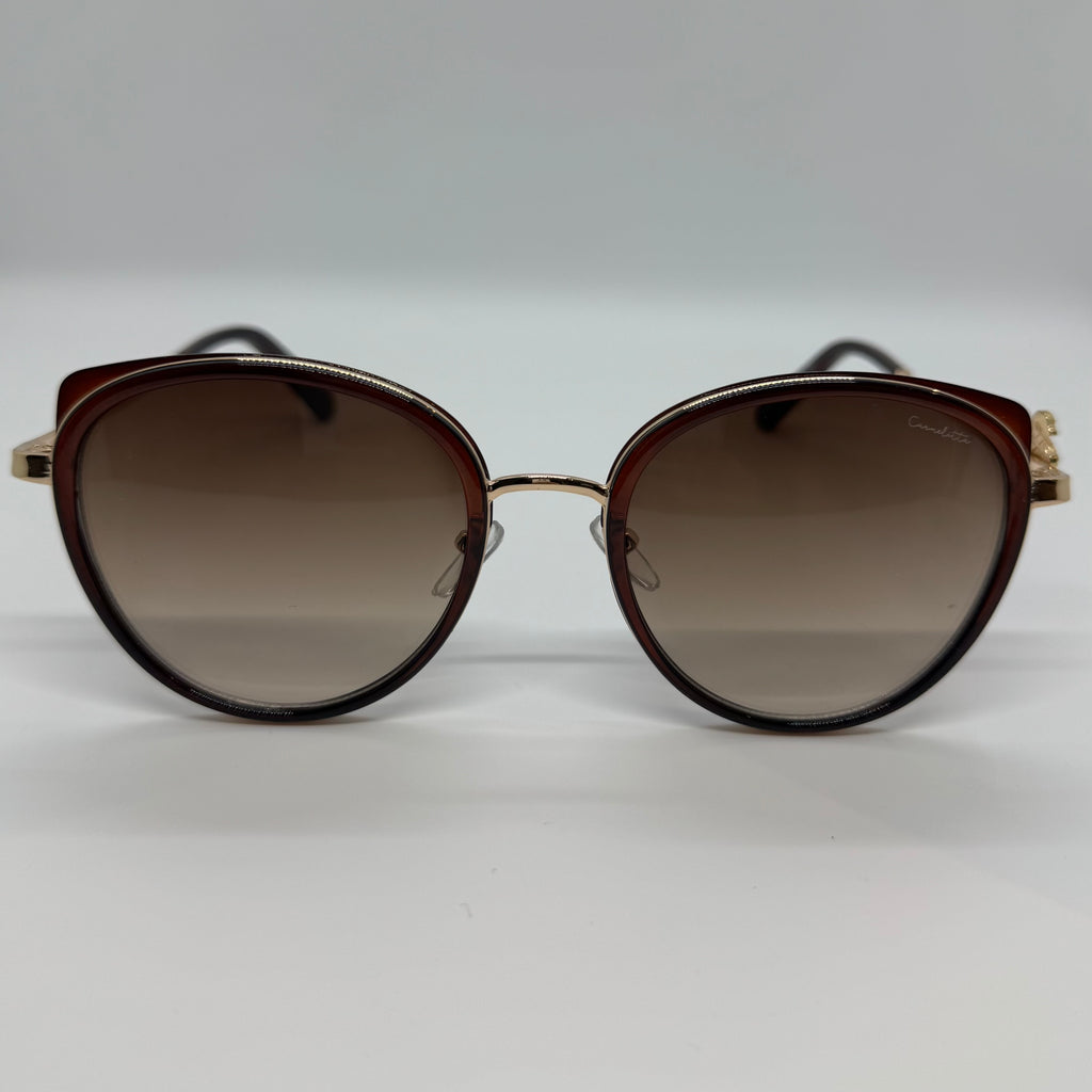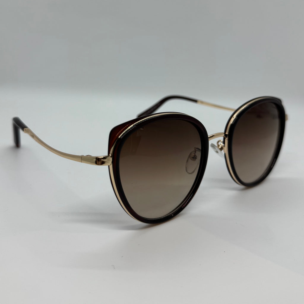 Óculos com hastes em meta dourado, frente em acetato marrom e lente marrom degrade.