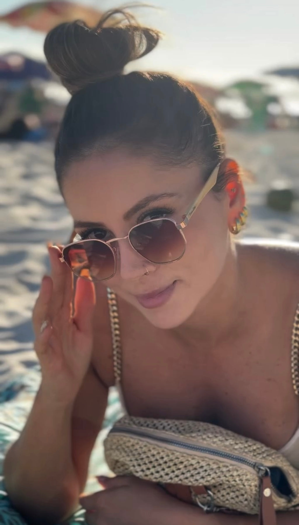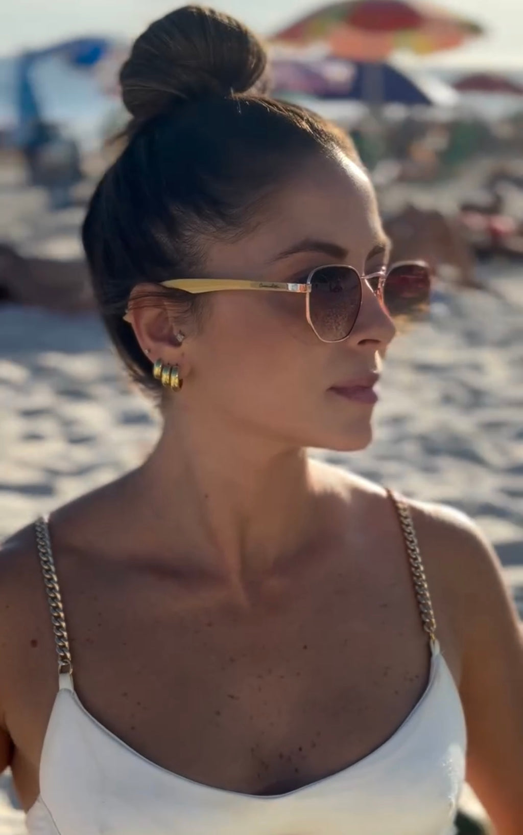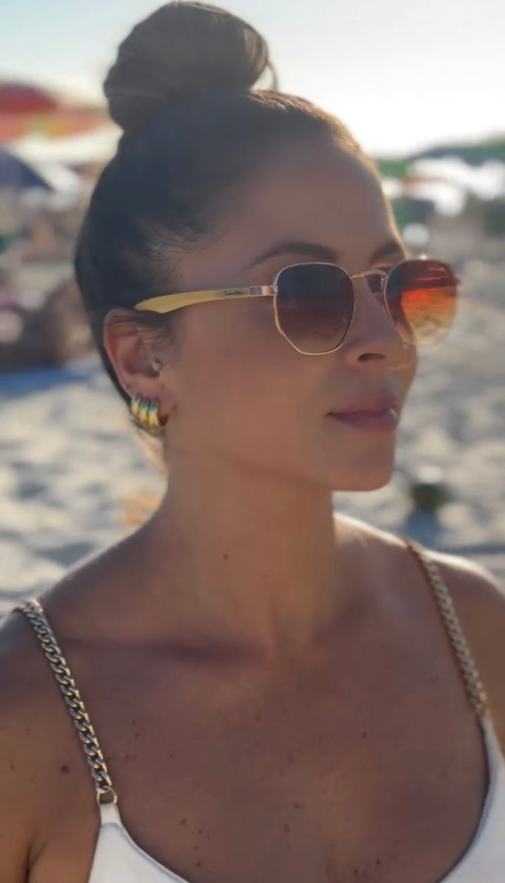 Óculos com hastes de bambu, armação rose e lente marrom degrade.
