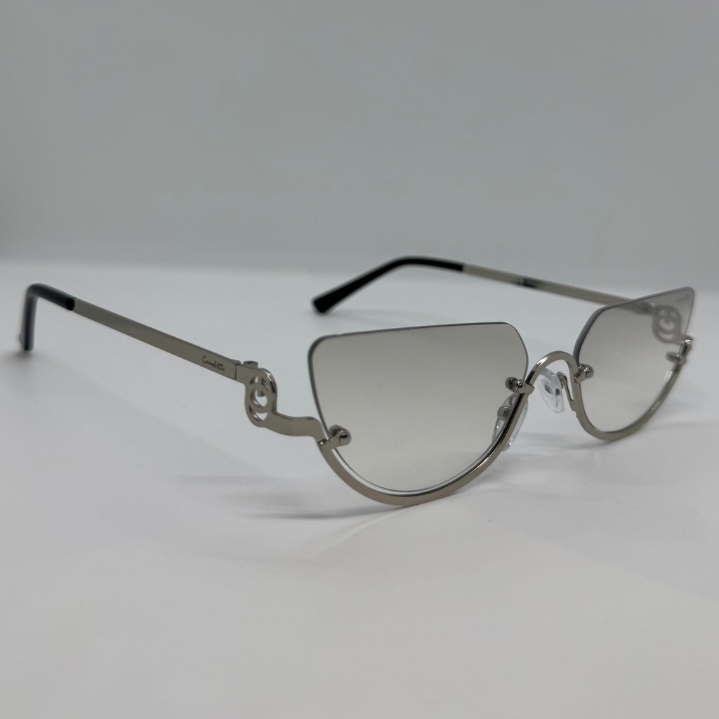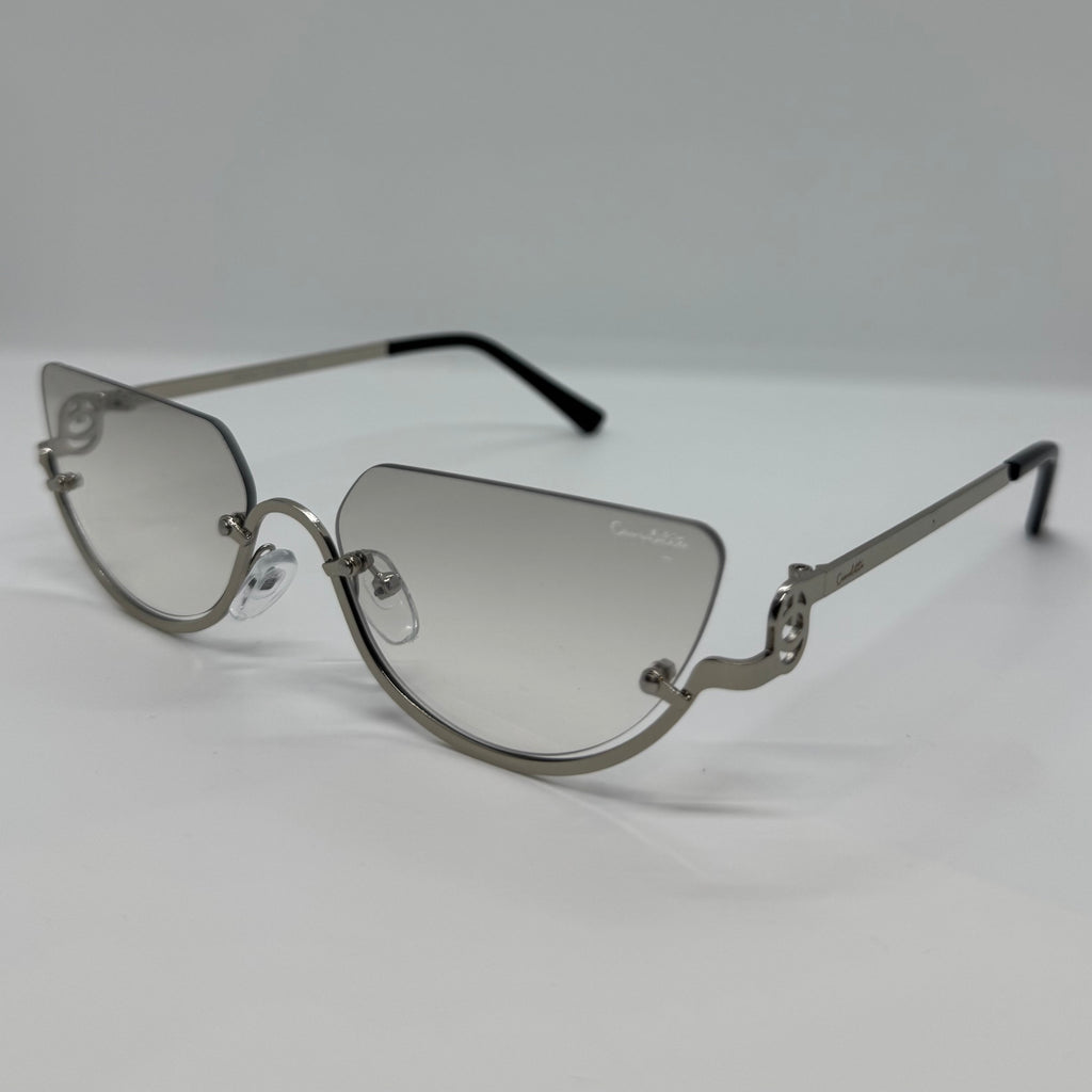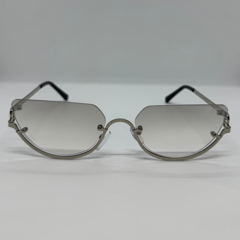 Óculos com hastes em metal prata e lente cinza degrade.