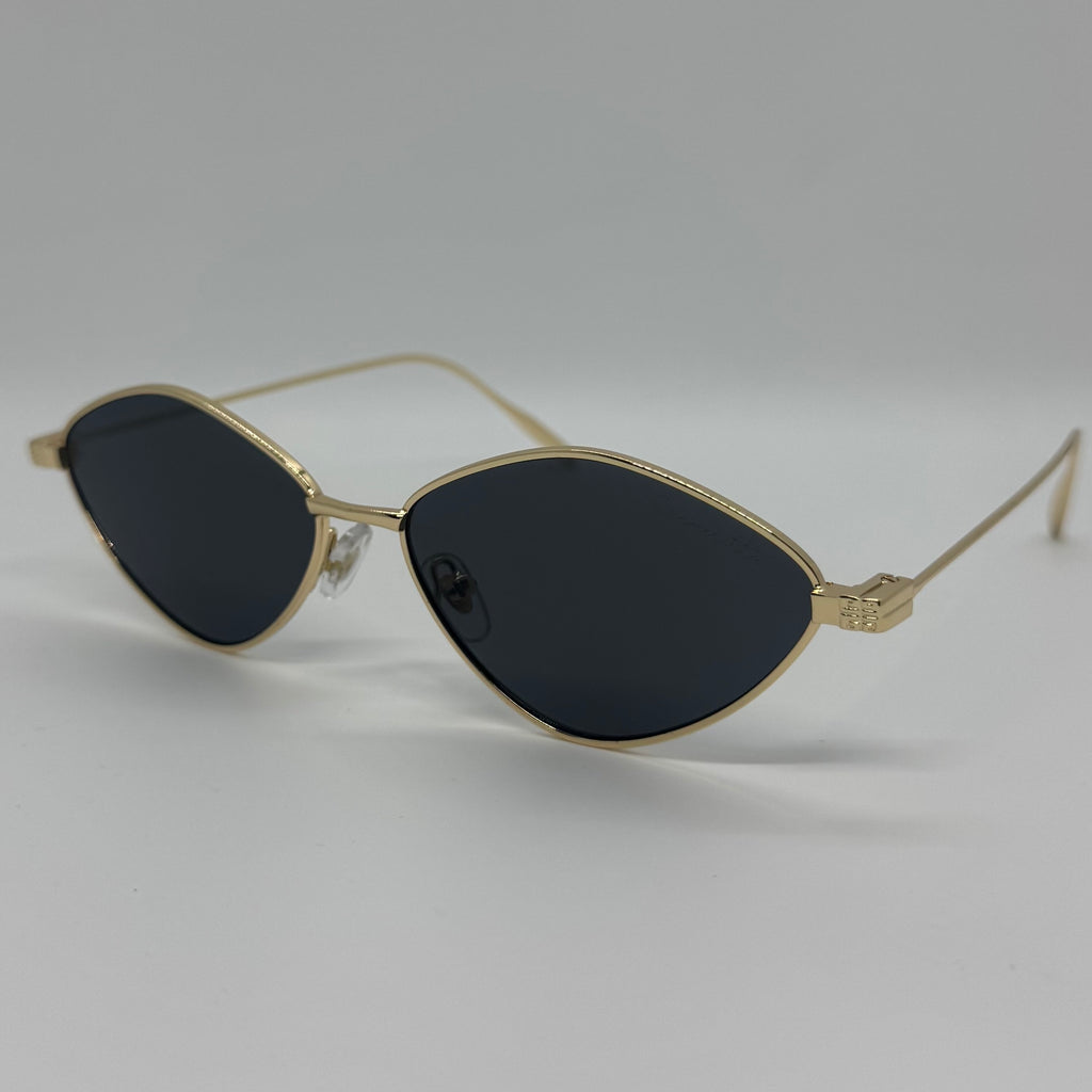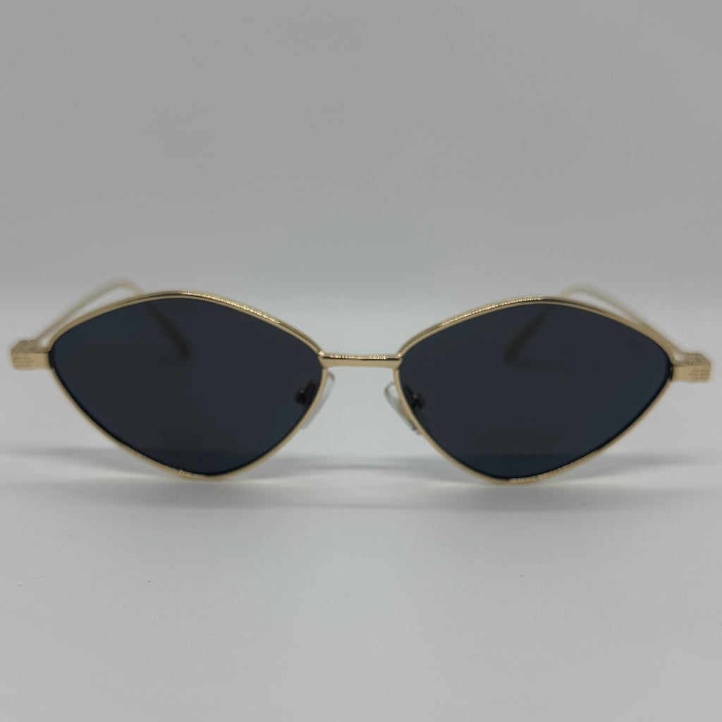 Óculos com hastes em metal dourado com lente preta.