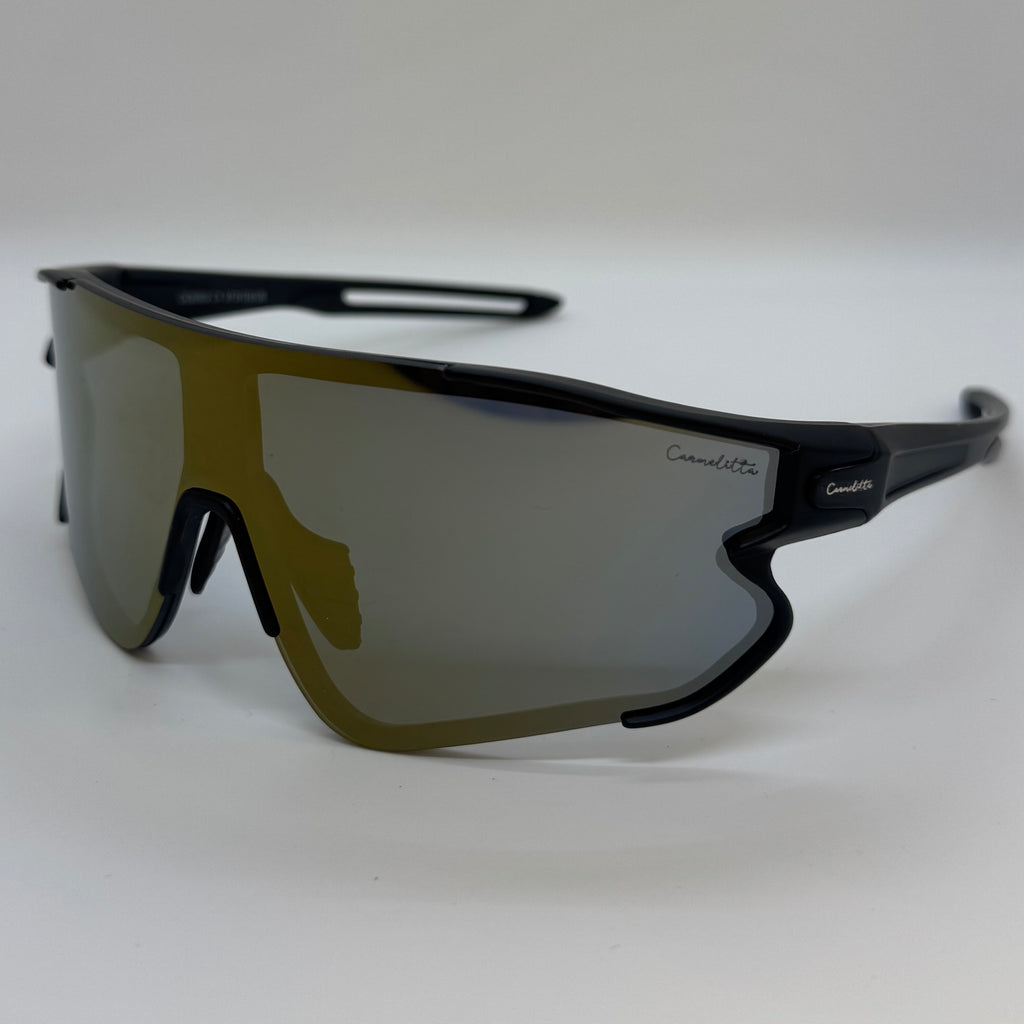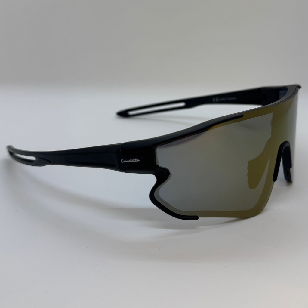 Óculos com hastes em acetato preto com lente dourada.