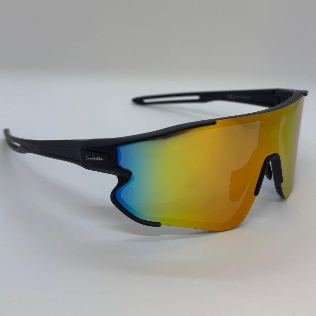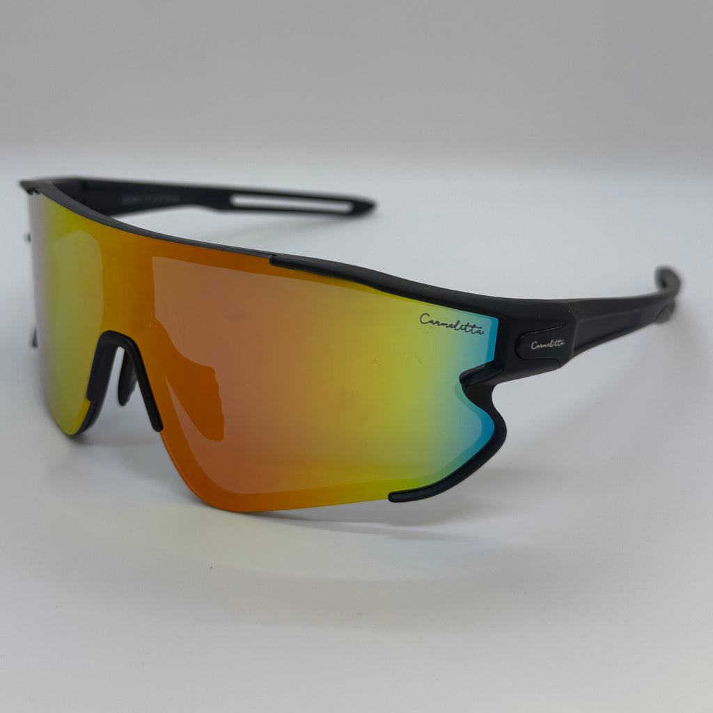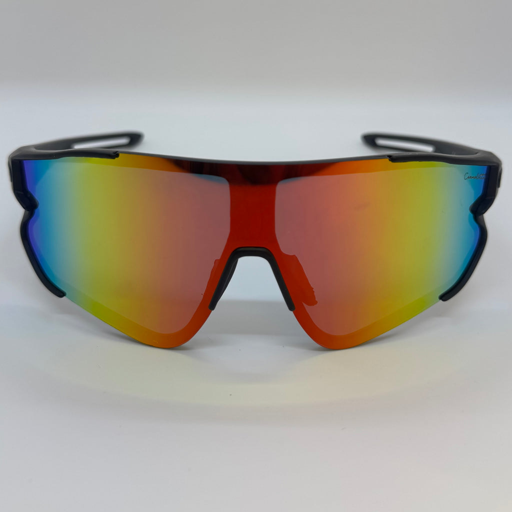 Óculos com hastes em acetato preto com lente vermelha e amarela espelhada.