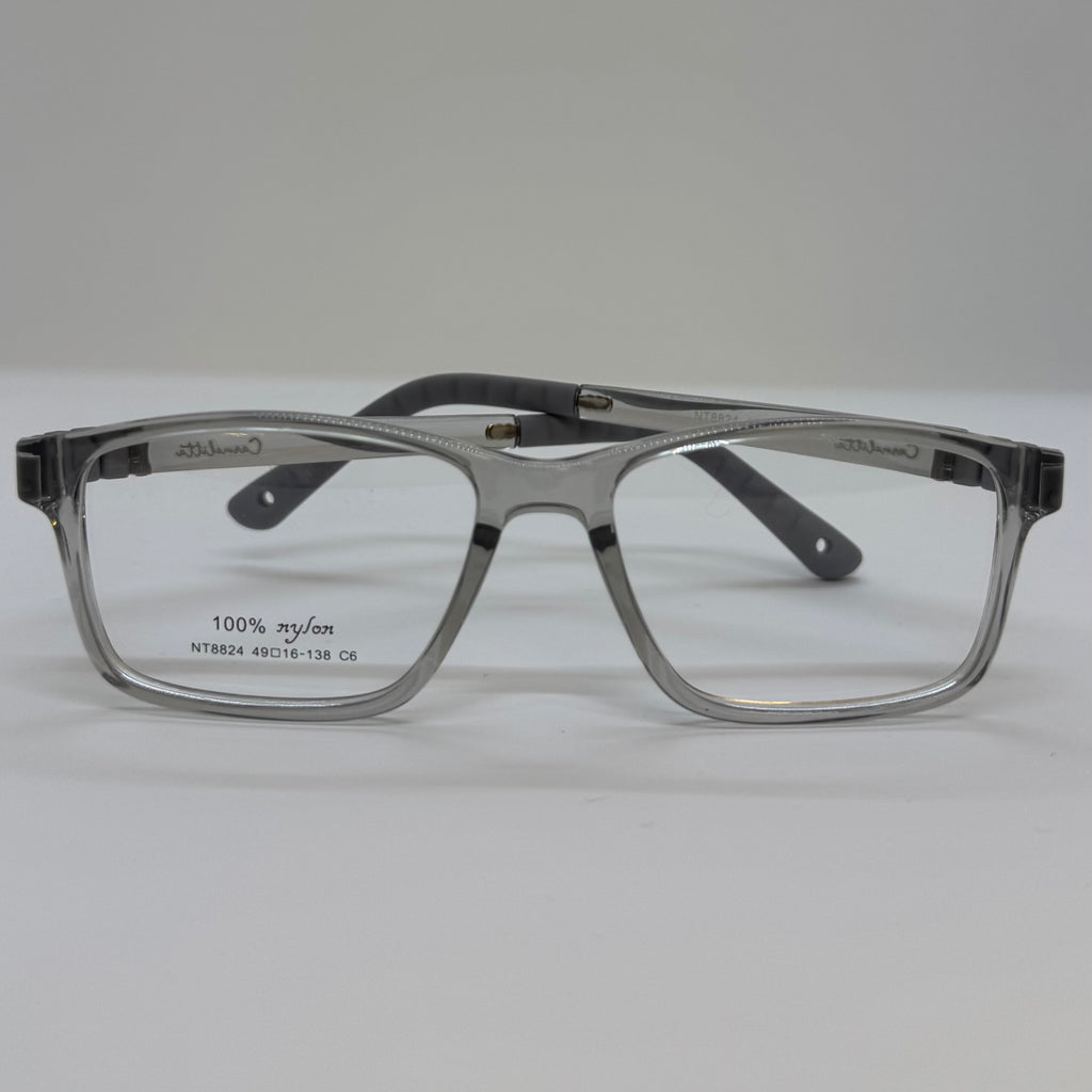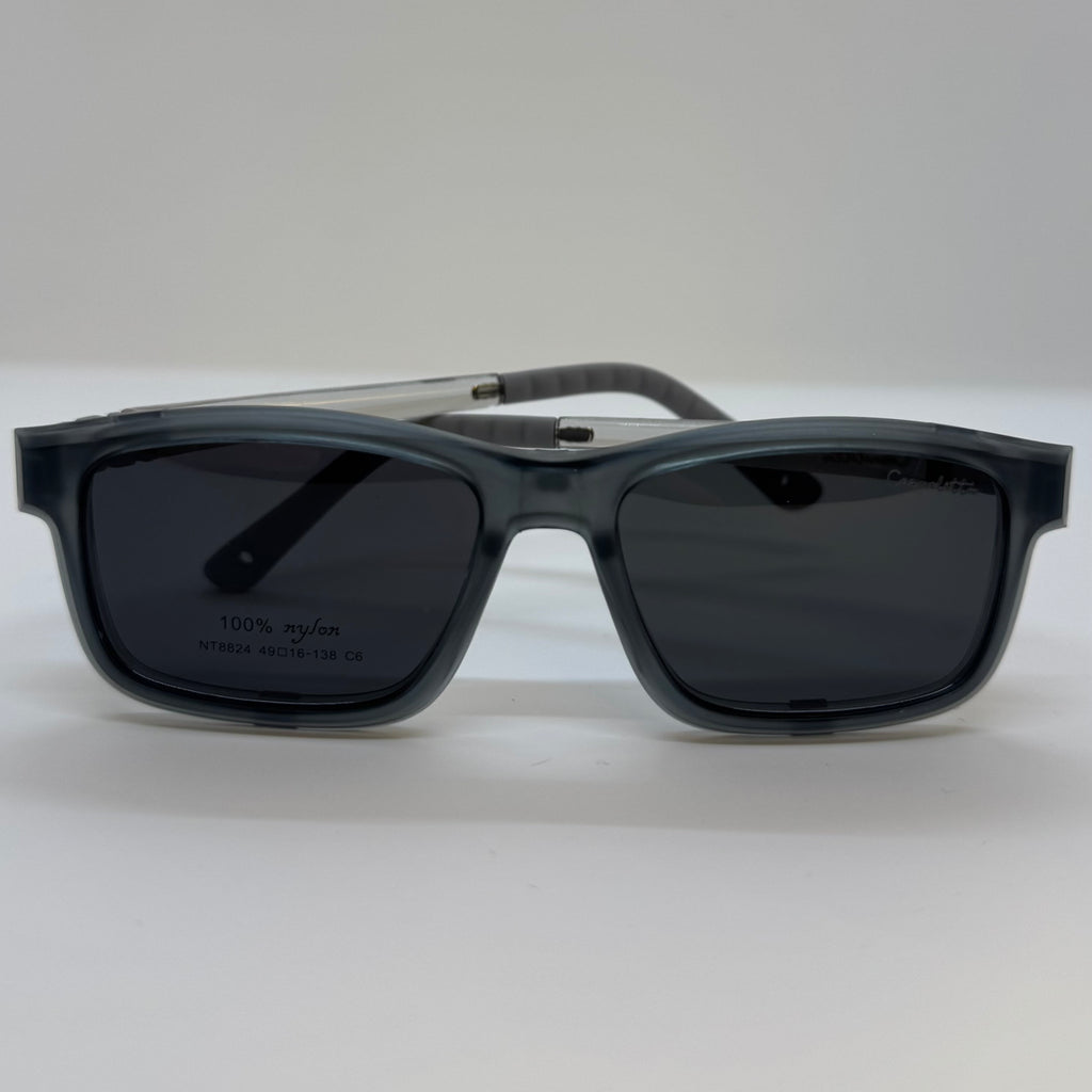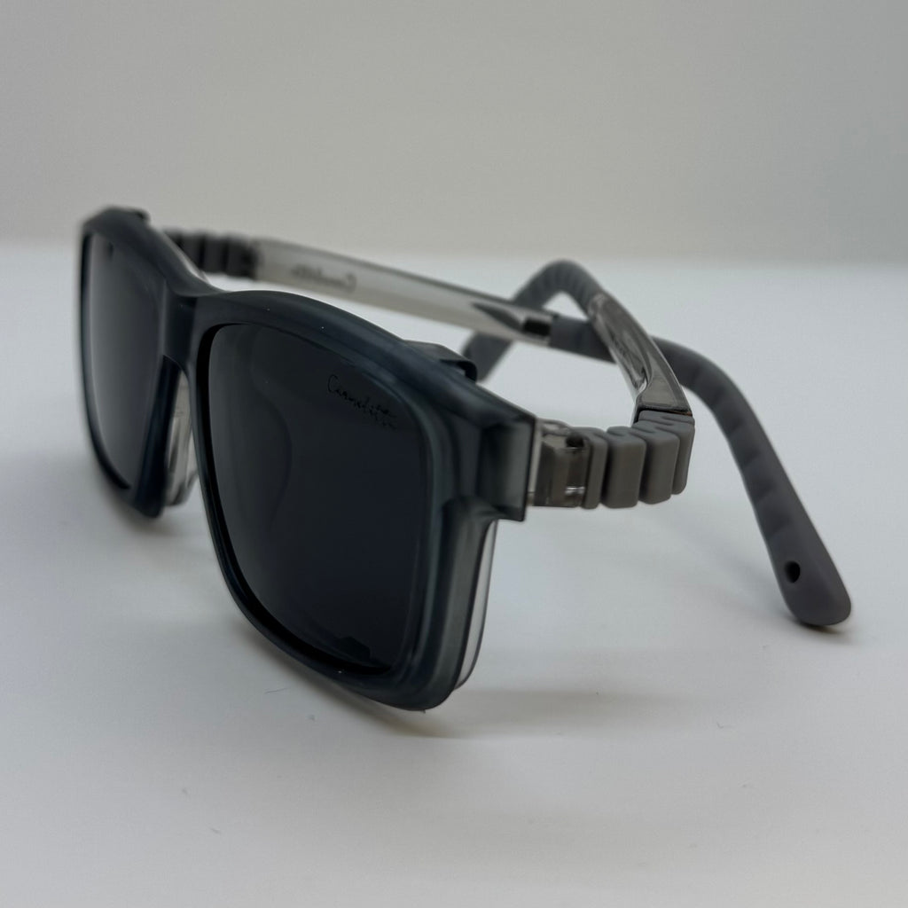 Acompanha frente solar em acetato cinza com lente preta polarizada.