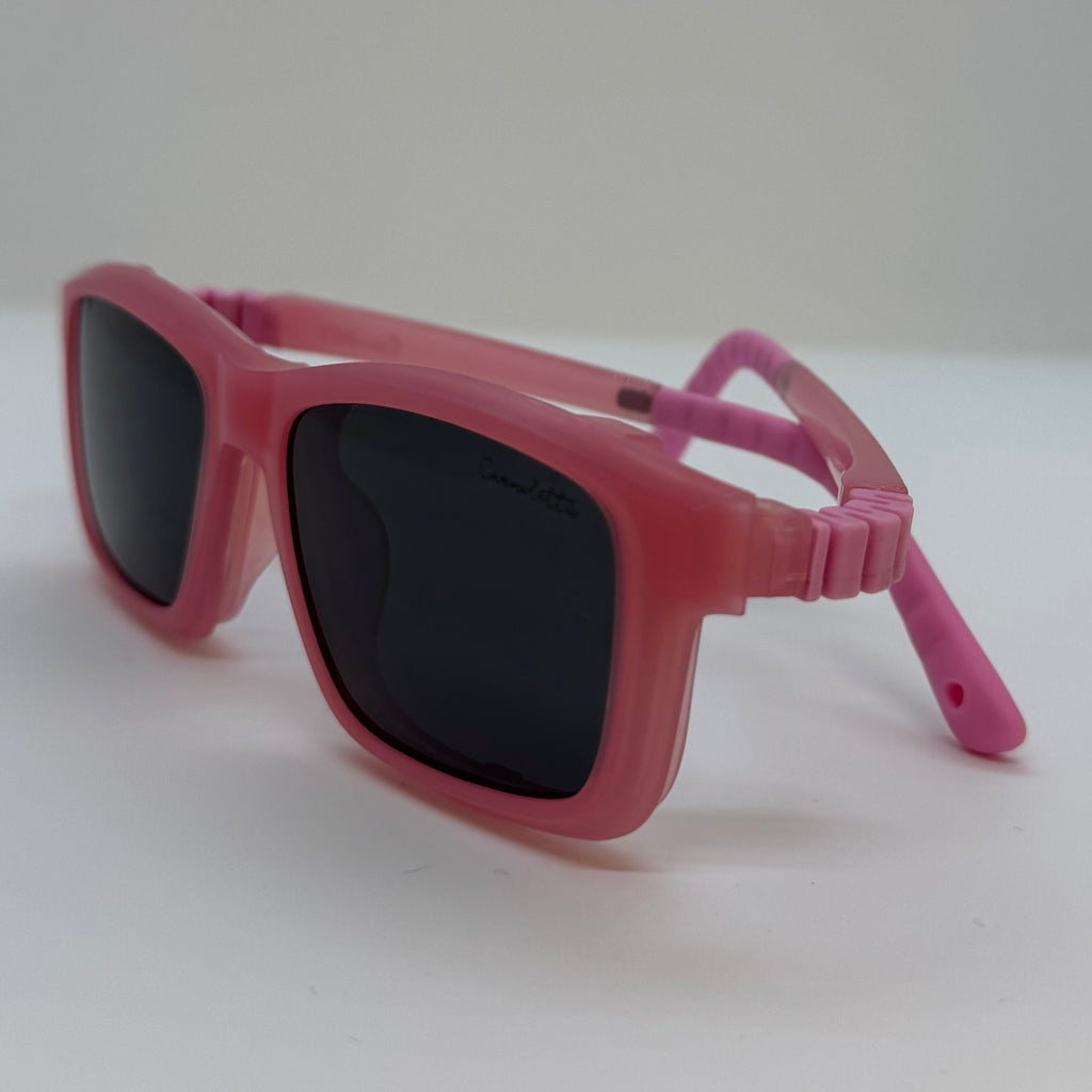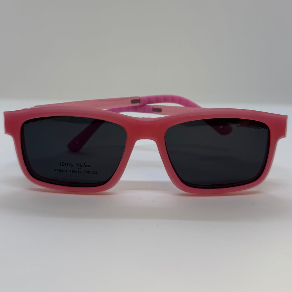 Acompanha frente solar e acetato na cor rosa com lente preta polarizada.
