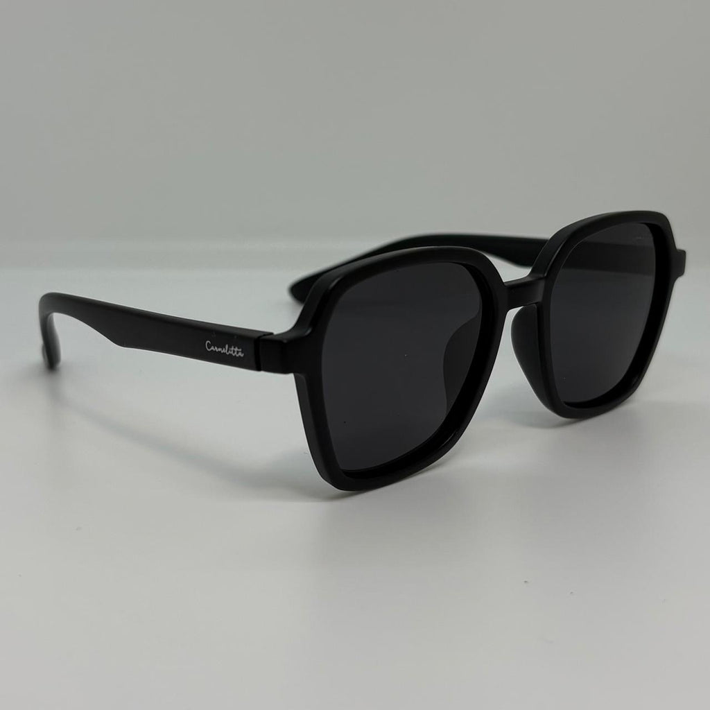 Óculos com hastes em silicone preto com lente preta polarizada.