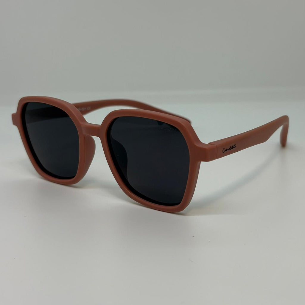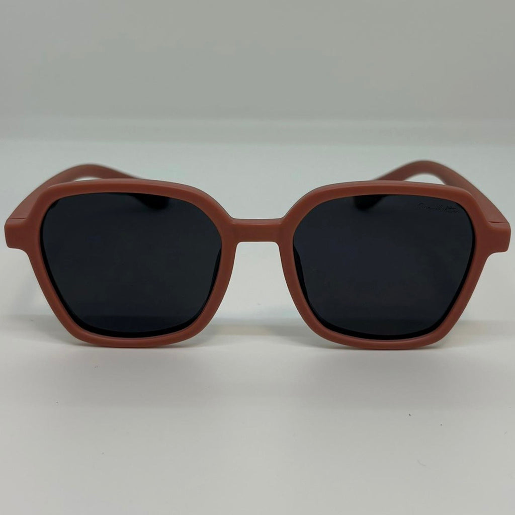 Óculos com hastes flexível em silicone marrom com lente preta polarizada. ( não quebra )