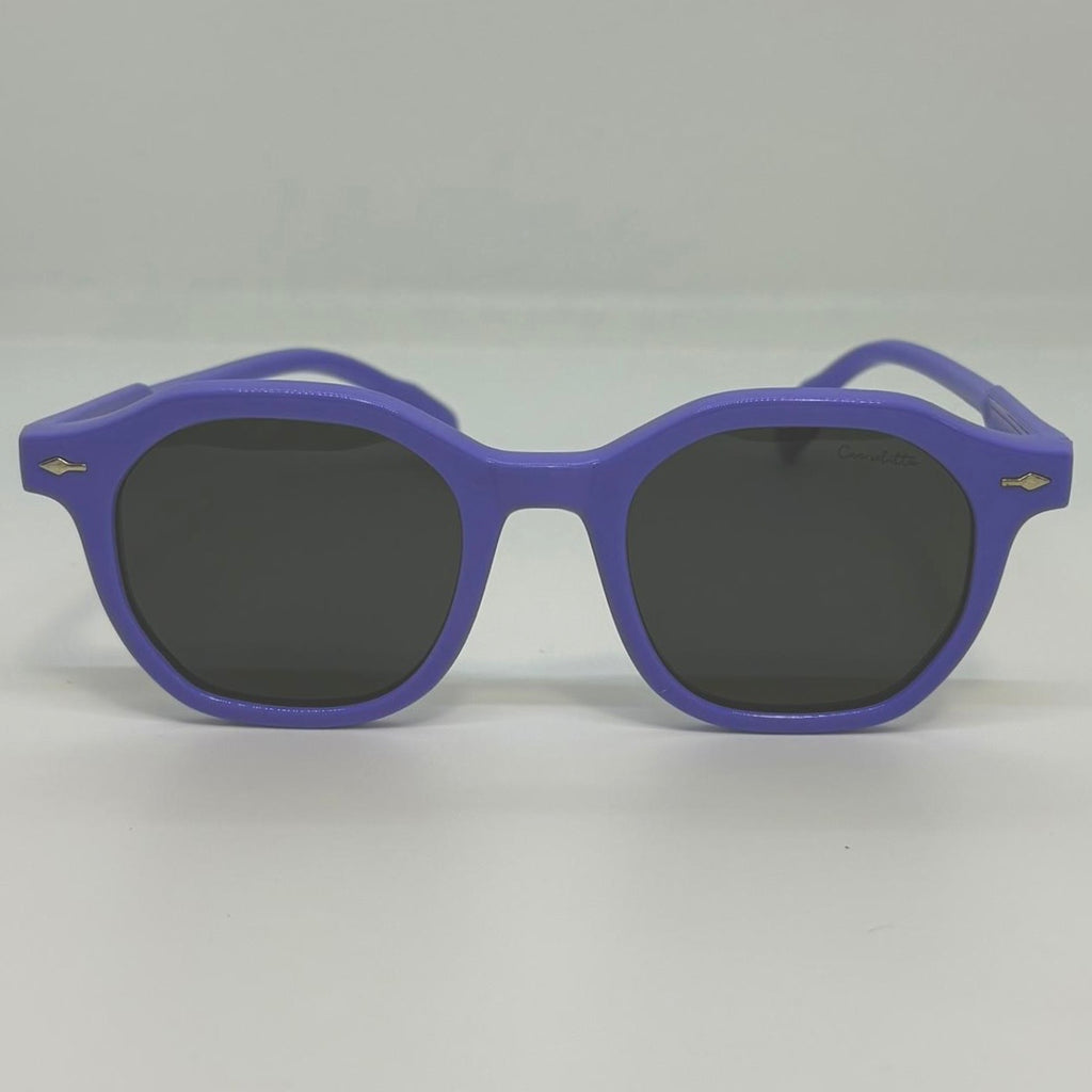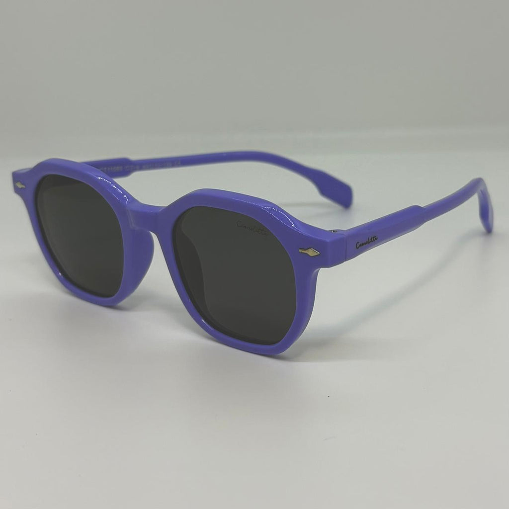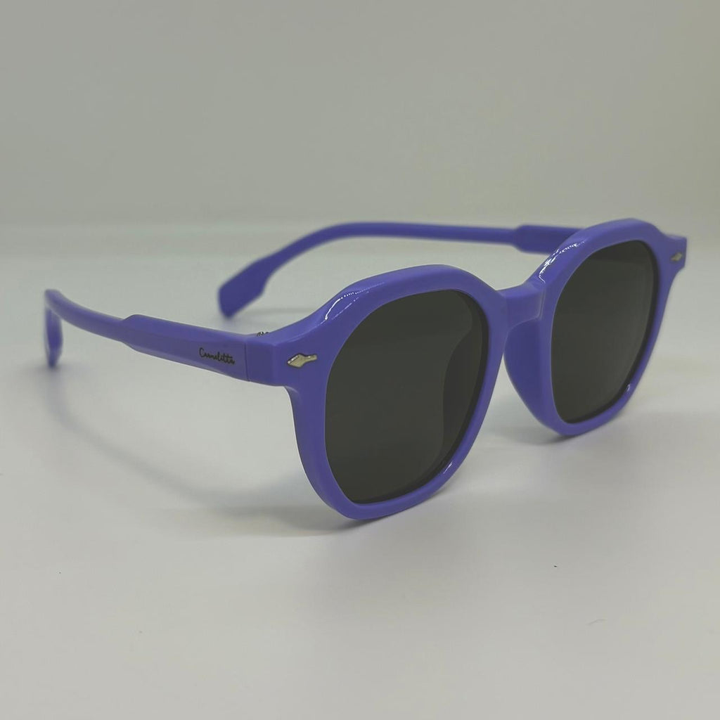 Óculos com hastes flexível em silicone lilás com lente preta polarizada. ( não quebra )